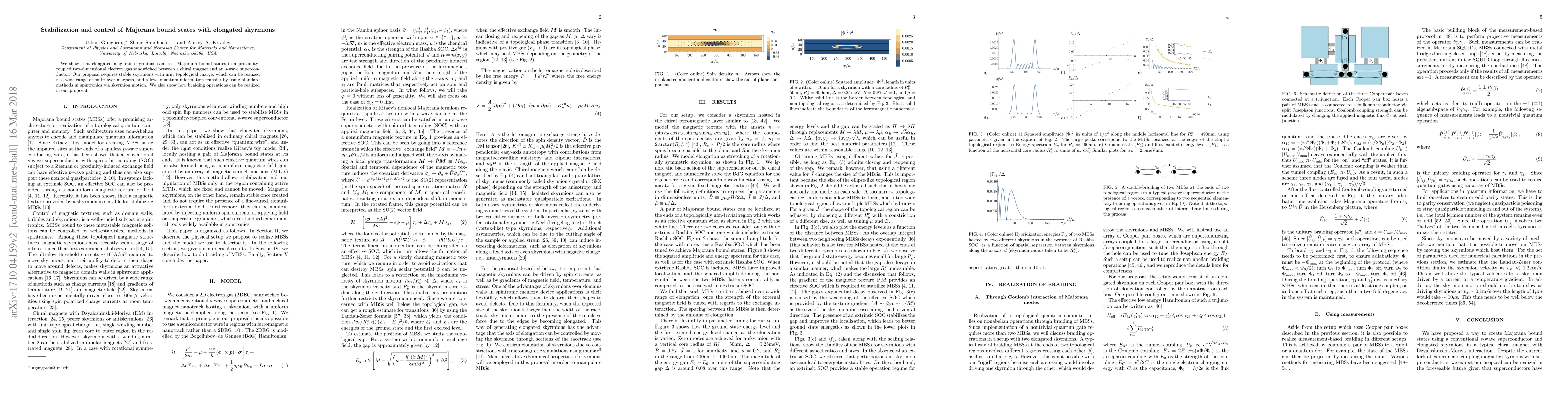 This paper proposes a method to stabilize and control Majorana bound states using elongated magnetic skyrmions in a two-dimensional electron gas between a chiral magnet and an $s$-wave superconductor, enabling quantum information transfer through skyrmion motion and demonstrating braiding operations.