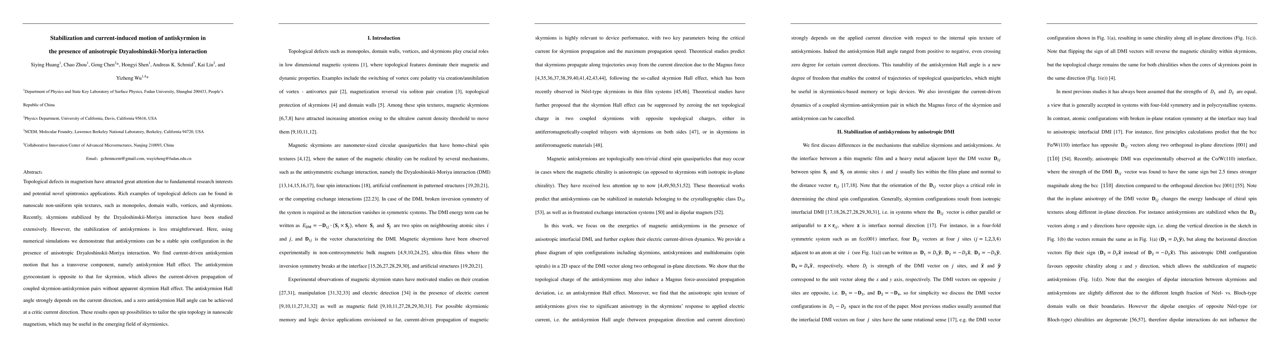 This paper demonstrates the stabilization of antiskyrmions in magnetic materials through anisotropic Dzyaloshinskii-Moriya interaction and explores their current-driven motion, revealing an antiskyrmion Hall effect with a gyroconstant opposite to skyrmions, potentially enabling novel spintronics applications.