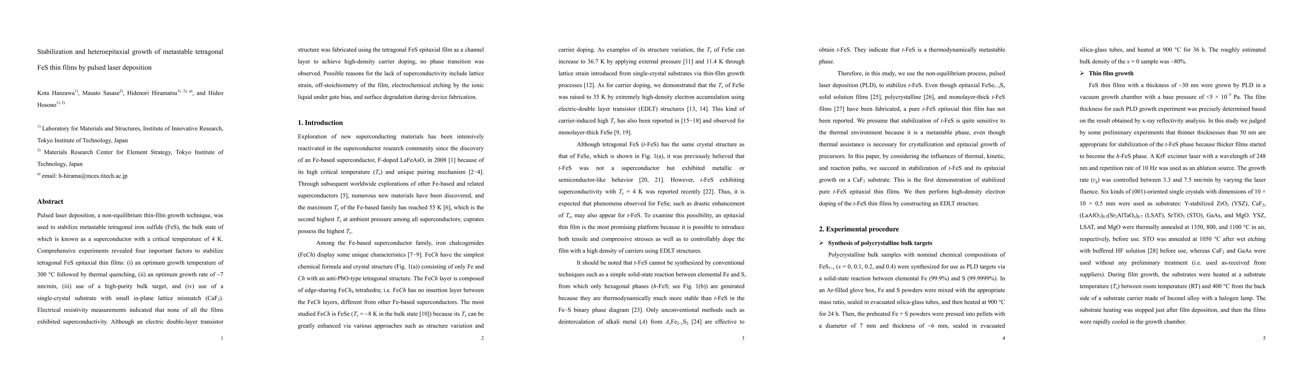 This study utilized pulsed laser deposition to grow metastable tetragonal FeS thin films, identifying critical factors for stabilization including optimal growth temperature, rate, target purity, and substrate choice. Despite efforts, the films did not exhibit superconductivity, likely due to factors such as lattice strain and surface degradation during device fabrication.