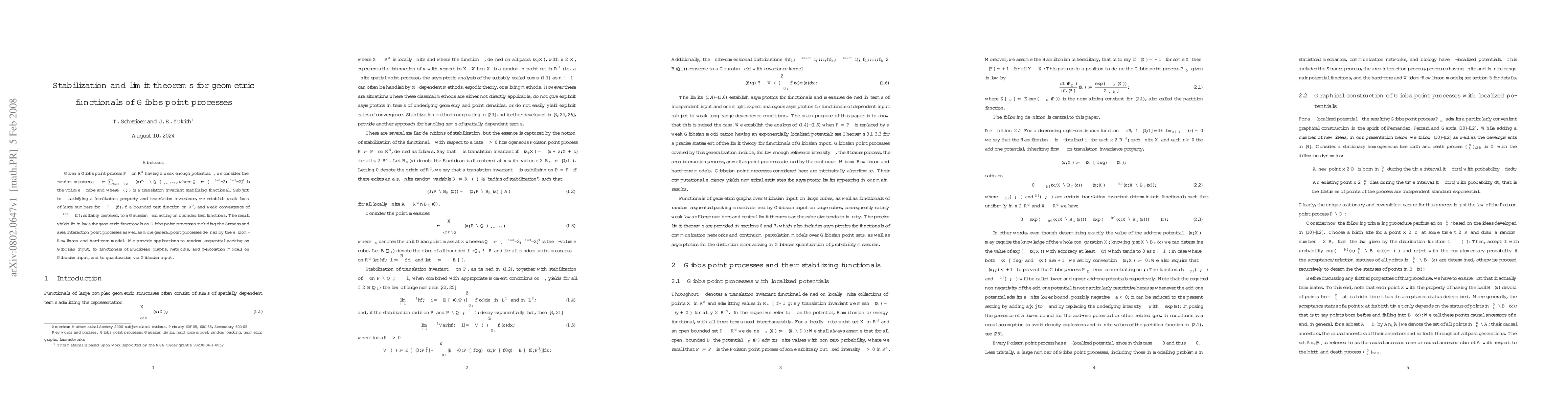 This paper establishes weak laws of large numbers and convergence results for geometric functionals of Gibbs point processes under suitable potential conditions. The findings apply to various point processes and have implications for random sequential packing, network models, and quantization.