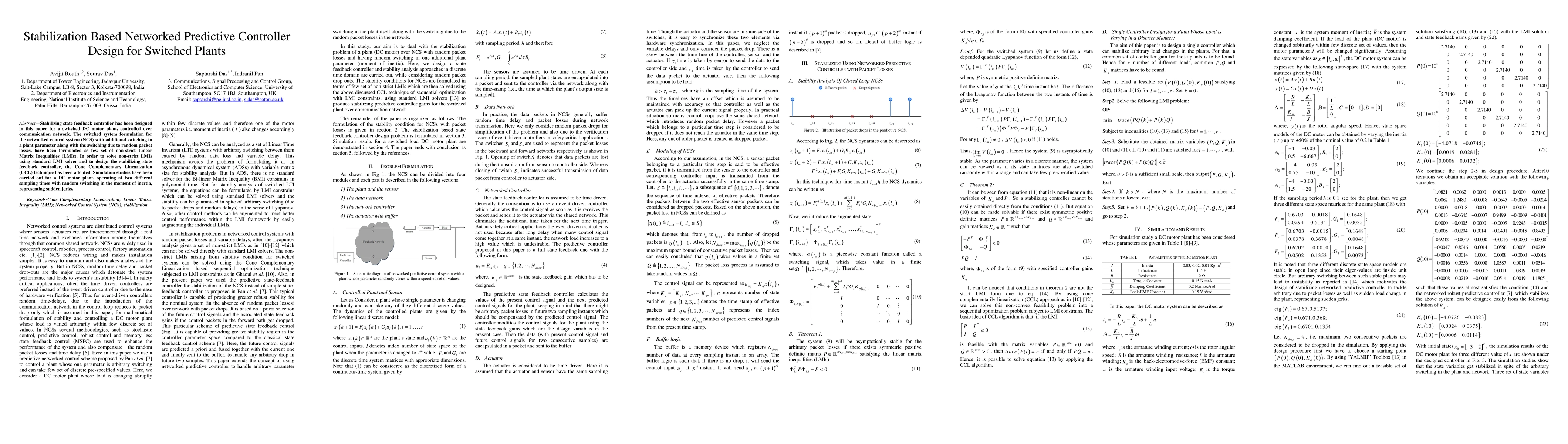 Researchers designed a stabilizing controller for a switched DC motor plant over a communication network, using a Cone Complementary Linearization technique to solve Linear Matrix Inequalities.