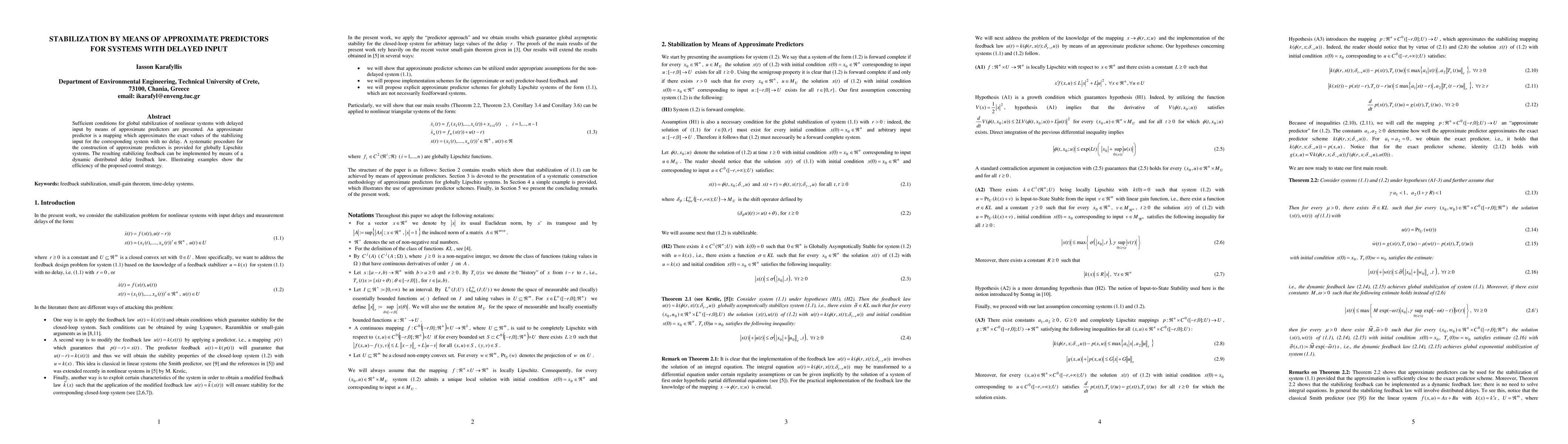 Sufficient conditions for global stabilization of nonlinear systems with delayed input by means of approximate predictors are presented. An approximate predictor is a mapping which approximates the exact values of the stabilizing input for the corresponding system with no delay. A systematic procedure for the construction of approximate predictors is provided for globally Lipschitz systems. The resulting stabilizing feedback can be implemented by means of a dynamic distributed delay feedback law. Illustrating examples show the efficiency of the proposed control strategy.