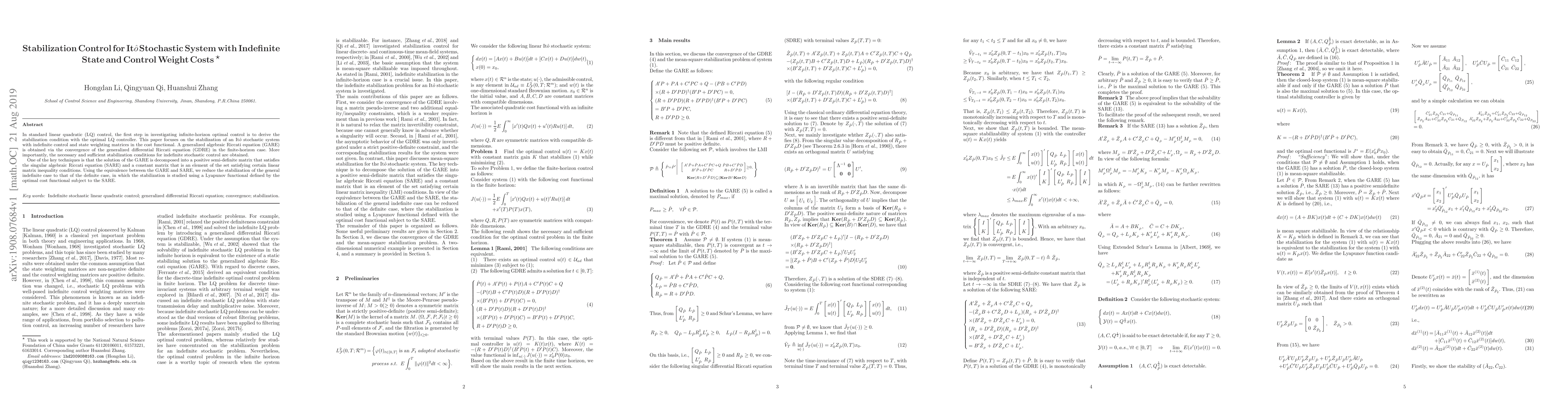 This paper investigates stabilization conditions for an Ito stochastic system with indefinite state and control weighting matrices. It derives a generalized algebraic Riccati equation and establishes necessary and sufficient stabilization conditions, reducing the indefinite case to a definite case using a Lyapunov functional.