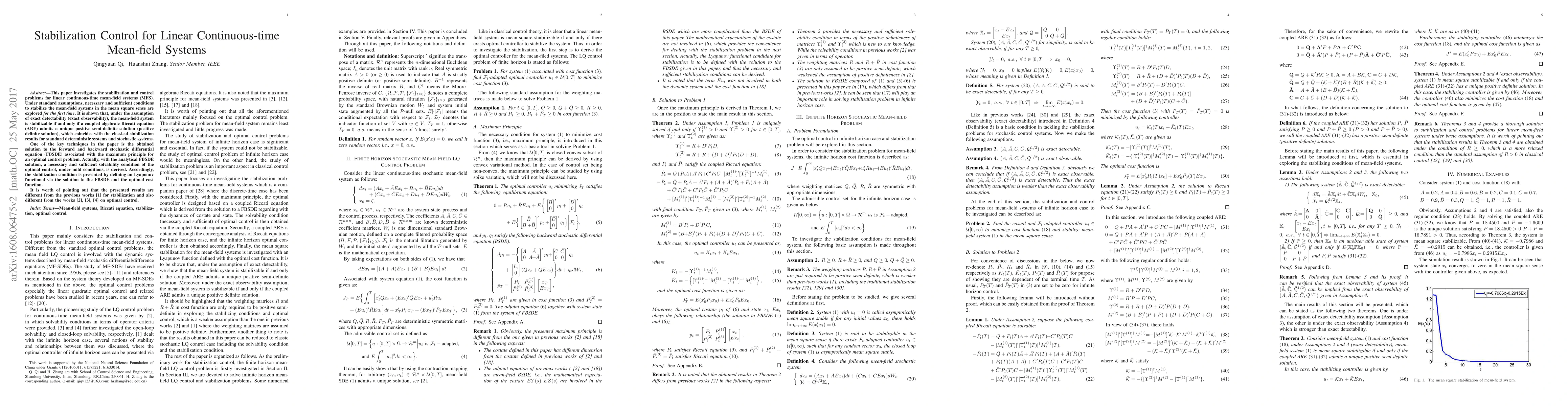 This paper explores stabilization conditions for linear continuous-time mean-field systems, showing that stabilizability depends on the solvability of a coupled algebraic Riccati equation. The key technique is the solution to a forward-backward stochastic differential equation, which aids in deriving a necessary and sufficient condition for optimal control.