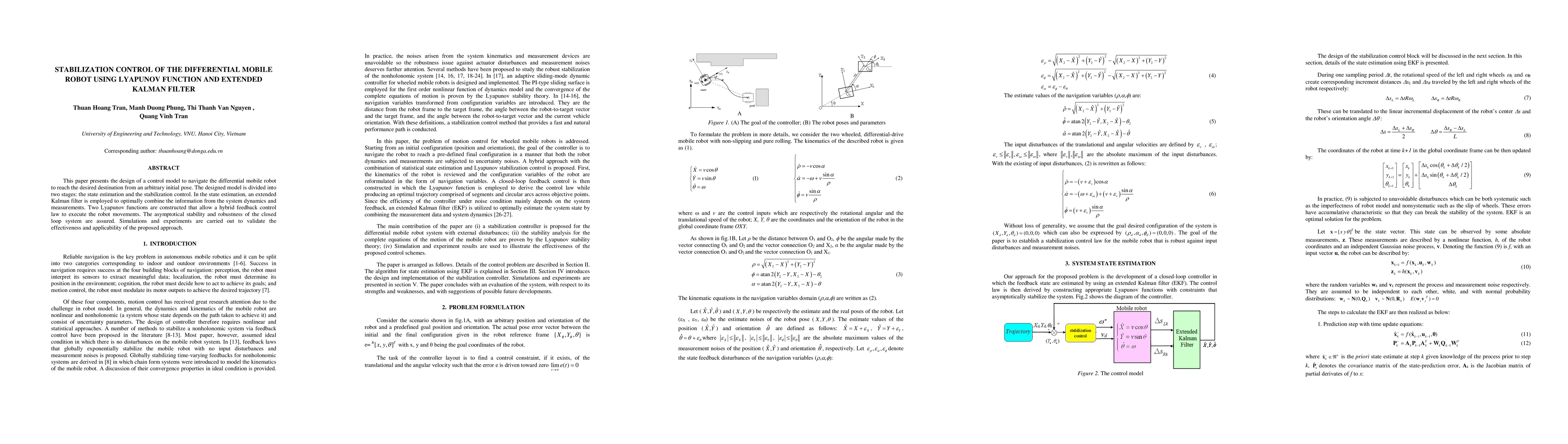 This paper designs a control model for a differential mobile robot using an extended Kalman filter for state estimation and Lyapunov functions for stabilization, ensuring asymptotic stability and robustness. Simulation and experimental results validate the effectiveness of the proposed approach.