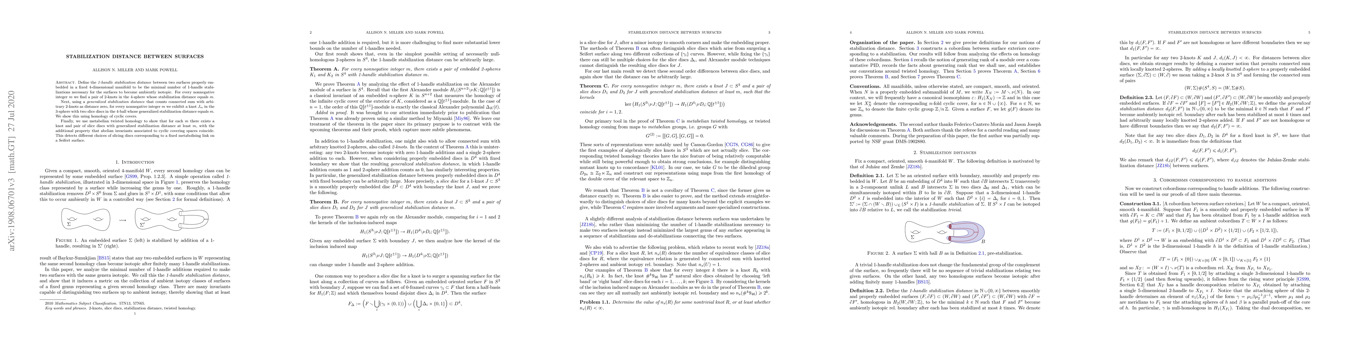 Define the 1-handle stabilization distance between two surfaces properly embedded in a fixed 4-dimensional manifold to be the minimal number of 1-handle stabilizations necessary for the surfaces to become ambiently isotopic. For every nonnegative integer $m$ we find a pair of 2-knots in the 4-sphere whose stabilization distance equals $m$. Next, using a generalized stabilization distance that counts connected sum with arbitrary 2-knots as distance zero, for every nonnegative integer $m$ we exhibit a knot $J_m$ in the 3-sphere with two slice discs in the 4-ball whose generalized stabilization distance equals $m$. We show this using homology of cyclic covers. Finally, we use metabelian twisted homology to show that for each $m$ there exists a knot and pair of slice discs with generalized stabilization distance at least $m$, with the additional property that abelian invariants associated to cyclic covering spaces coincide. This detects different choices of slicing discs corresponding to a fixed metabolising link on a Seifert surface.