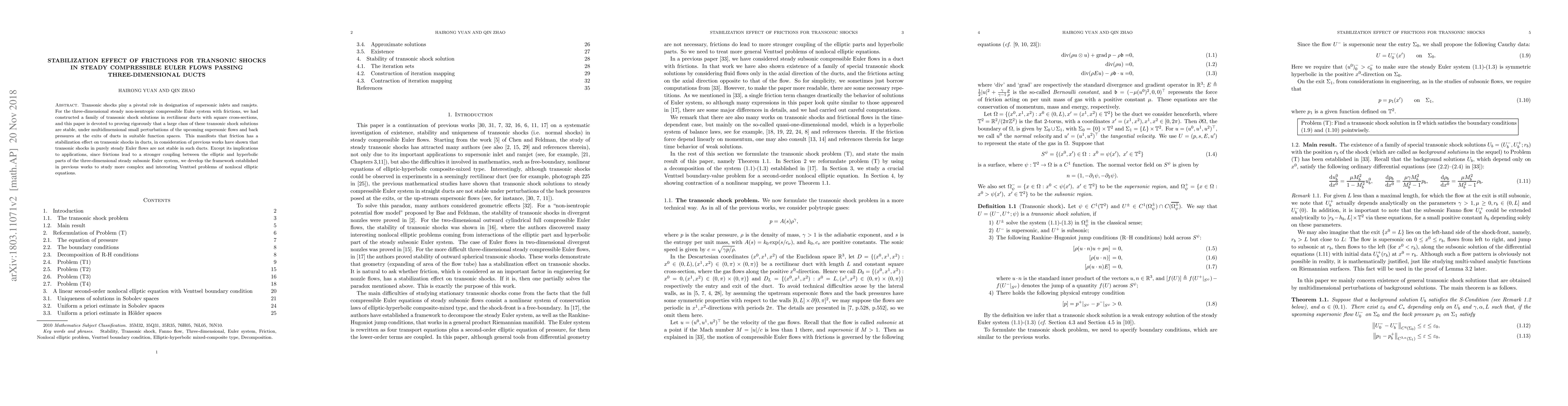This paper rigorously proves the stability of transonic shock solutions in three-dimensional ducts under small perturbations, demonstrating that friction stabilizes these shocks, contrasting with the instability seen in purely Euler flows. The findings also extend the framework for studying complex Venttsel problems in nonlocal elliptic equations.