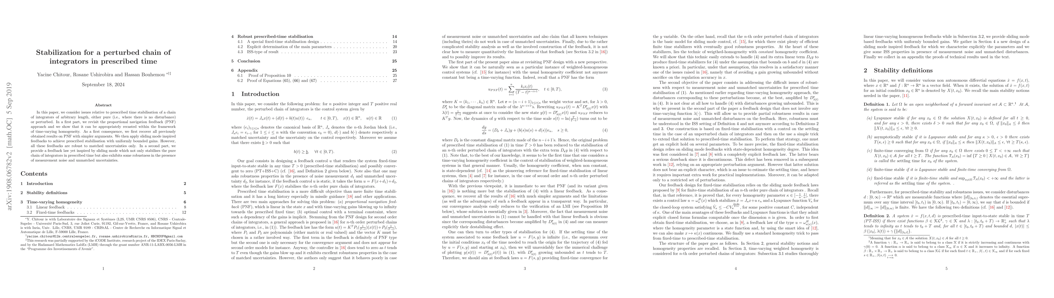 A paper on stabilizing a chain of integrators in prescribed time with feedback laws that can handle perturbations and measurement noise, improving upon existing proportional navigation feedback approaches.