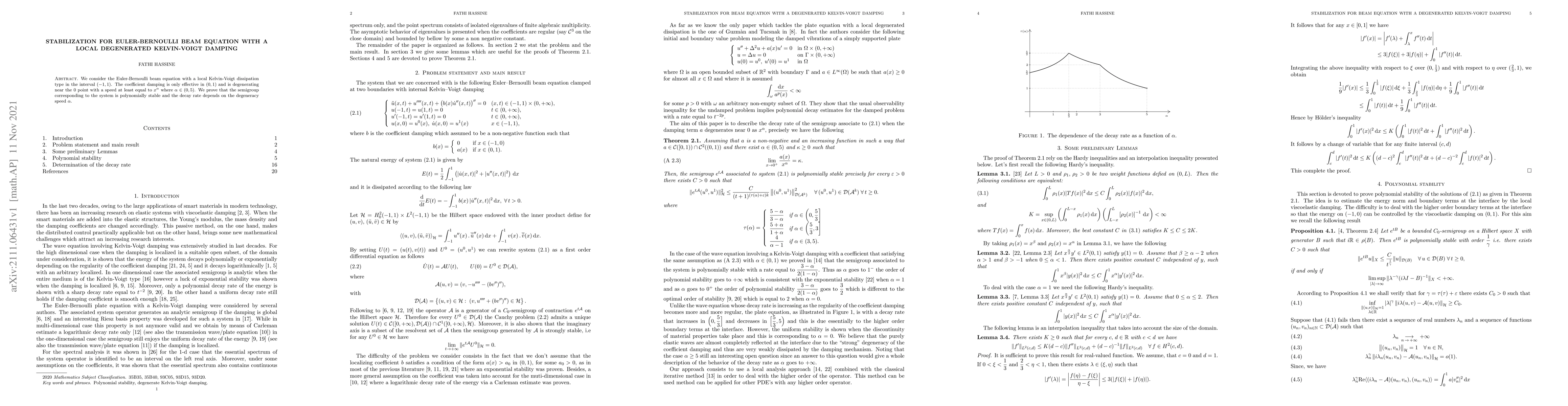 Summary: This paper investigates the stabilization of the Euler-Bernoulli beam equation with a locally degenerated Kelvin-Voigt damping. The study proves polynomial stability of the system's semigroup, with the decay rate influenced by the damping's degeneration speed near the origin.
