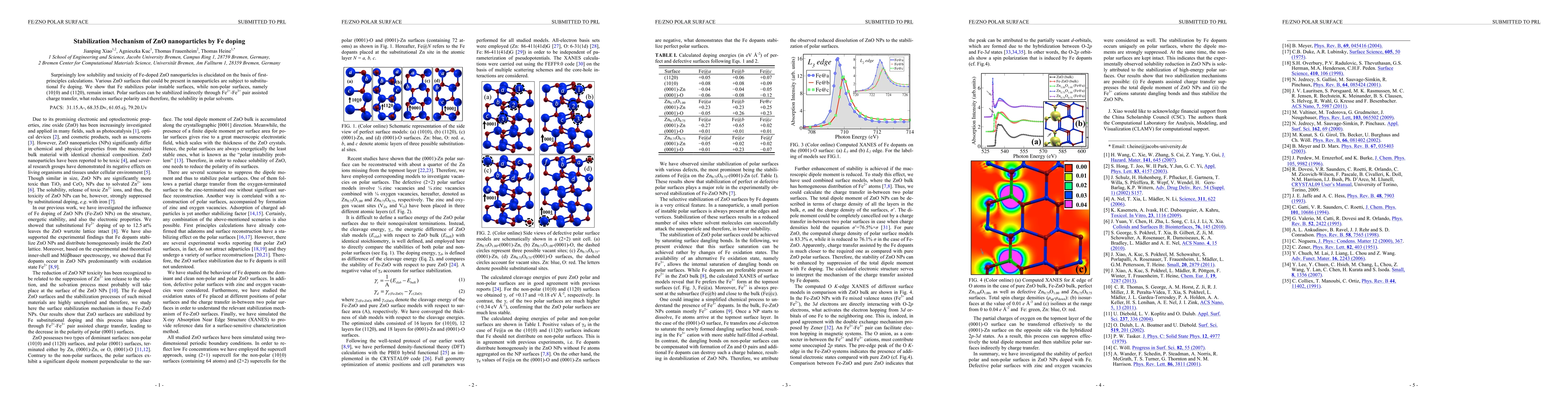 This study reveals that Fe doping stabilizes ZnO nanoparticles by reducing the solubility of polar surfaces through Fe2+-Fe3+ pair-assisted charge transfer, while non-polar surfaces remain unaffected, thereby lowering the overall toxicity.