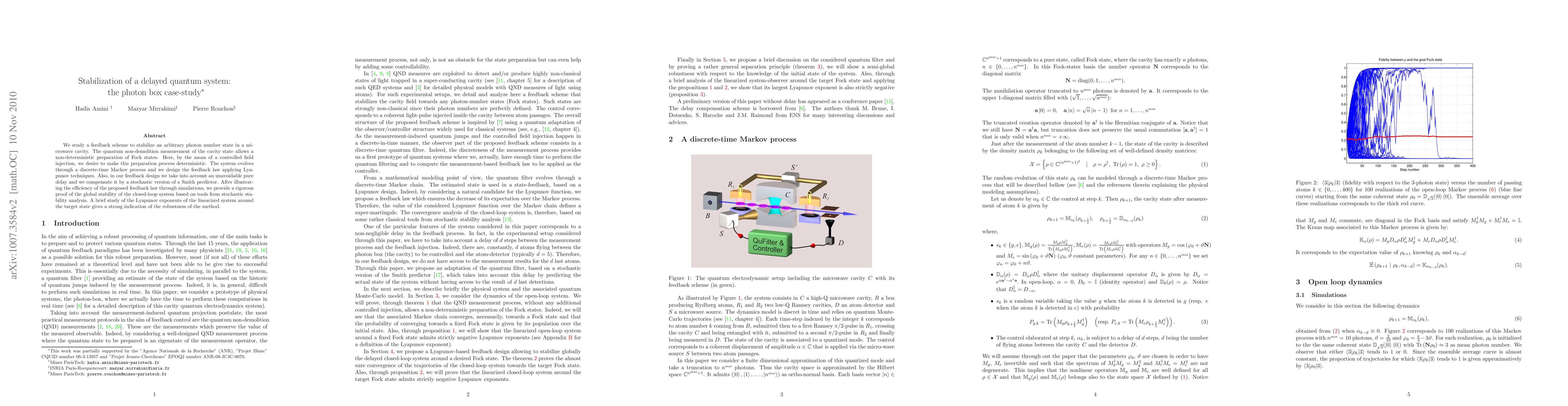 We study a feedback scheme to stabilize an arbitrary photon number state in a microwave cavity. The quantum non-demolition measurement of the cavity state allows a non-deterministic preparation of Fock states. Here, by the mean of a controlled field injection, we desire to make this preparation process deterministic. The system evolves through a discrete-time Markov process and we design the feedback law applying Lyapunov techniques. Also, in our feedback design we take into account an unavoidable pure delay and we compensate it by a stochastic version of a Smith predictor. After illustrating the efficiency of the proposed feedback law through simulations, we provide a rigorous proof of the global stability of the closed-loop system based on tools from stochastic stability analysis. A brief study of the Lyapunov exponents of the linearized system around the target state gives a strong indication of the robustness of the method.