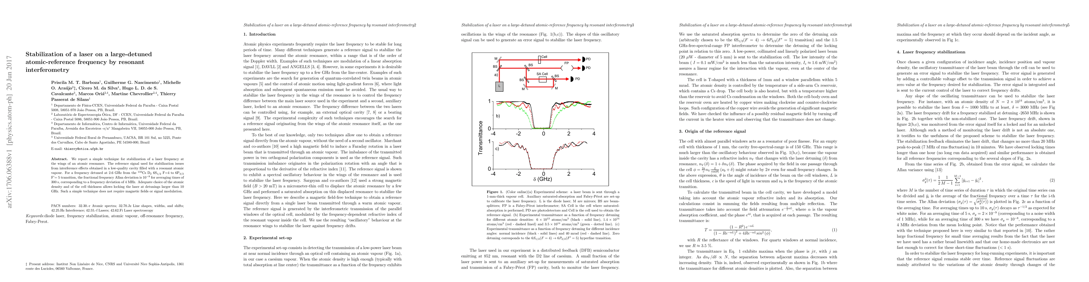 We report a simple technique for stabilization of a laser frequency at the wings of an atomic resonance. The reference signal used for stabilization issues from interference effects obtained in a low-quality cavity filled with a resonant atomic vapour. For a frequency detuned at 2.6 GHz from the $^{133}$Cs D$_2$ 6S$_{1/2}$ F=4 to 6P$_{3/2}$ F'= 5 transition, the fractional frequency Allan deviation is $10^{-8}$ for averaging times of 300 s, corresponding to a frequency deviation of 4 MHz. Adequate choice of the atomic density and of the cell thickness allows locking the laser at detunings larger than 10 GHz. Such a simple technique does not require magnetic fields or signal modulation.