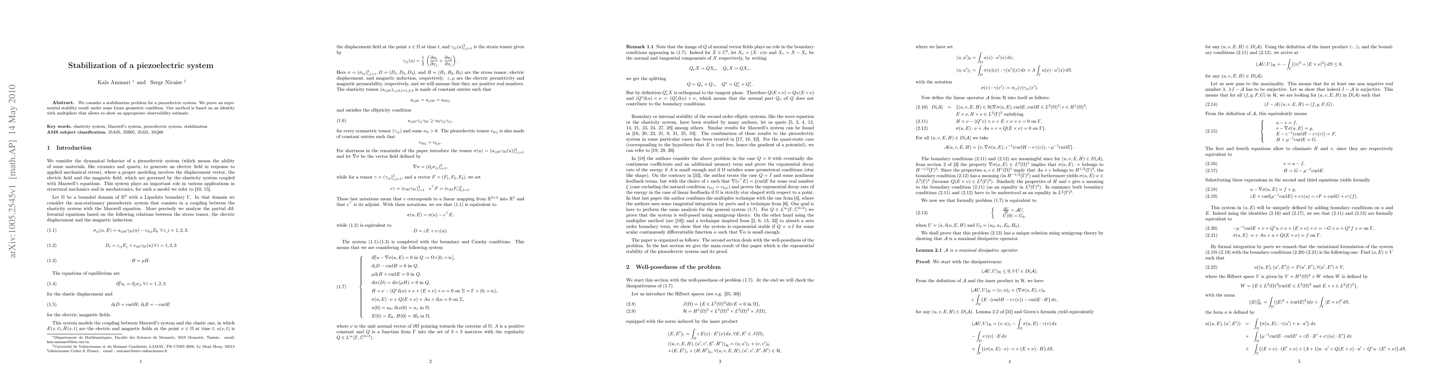 Researchers prove exponential stability of a piezoelectric system under certain conditions, using an observability estimate based on an identity with multipliers.