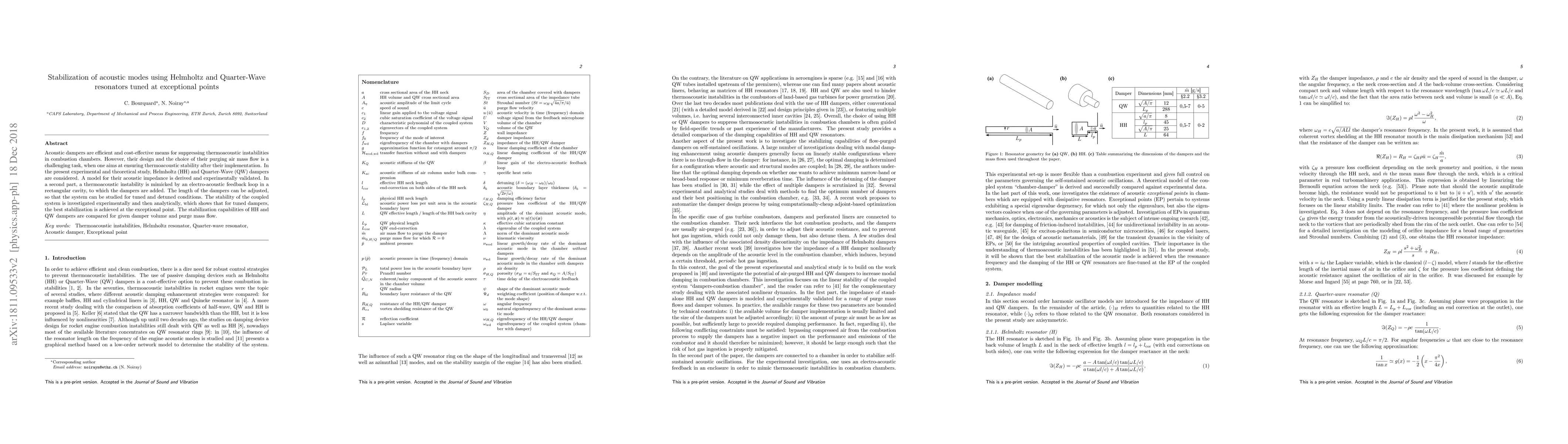 This study investigates the use of Helmholtz and Quarter-Wave dampers to stabilize acoustic modes in combustion chambers, finding that tuned dampers achieve best stabilization at exceptional points.