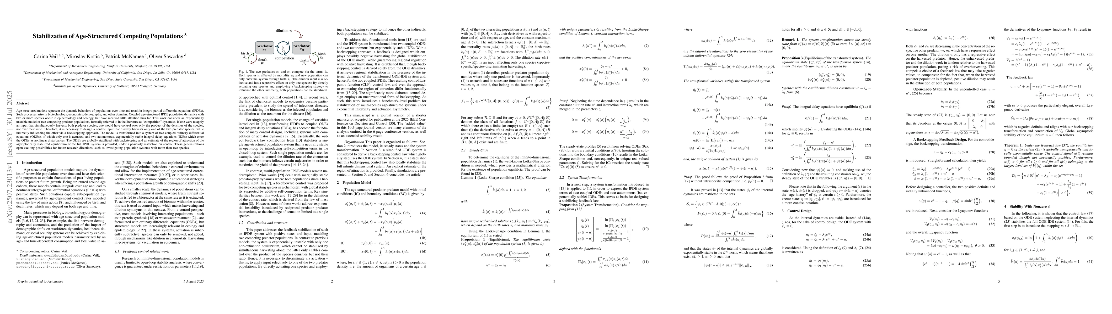 Age-structured models represent the dynamic behaviors of populations over time and result in integro-partial differential equations (IPDEs). Such processes arise in biotechnology, economics, demography, and other domains. Coupled age-structured IPDE population dynamics with two or more species occur in epidemiology and ecology, but have received little attention thus far. This work considers an exponentially unstable model of two competing predator populations, formally referred to in the literature as ''competition'' dynamics. If one were to apply an input that simultaneously harvests both predator species, one would have control over only the product of the densities of the species, not over their ratio. Therefore, it is necessary to design a control input that directly harvests only one of the two predator species, while indirectly influencing the other via a backstepping approach. The model is transformed into a system of two coupled ordinary differential equations (ODEs), of which only one is actuated, and two autonomous, exponentially stable integral delay equations (IDEs) which enter the ODEs as nonlinear disturbances. The ODEs are globally stabilized with backstepping and an estimate of the region of attraction of the asymptotically stabilized equilibrium of the full IPDE system is provided, under a positivity restriction on control. These generalizations open exciting possibilities for future research directions, such as investigating population systems with more than two species.