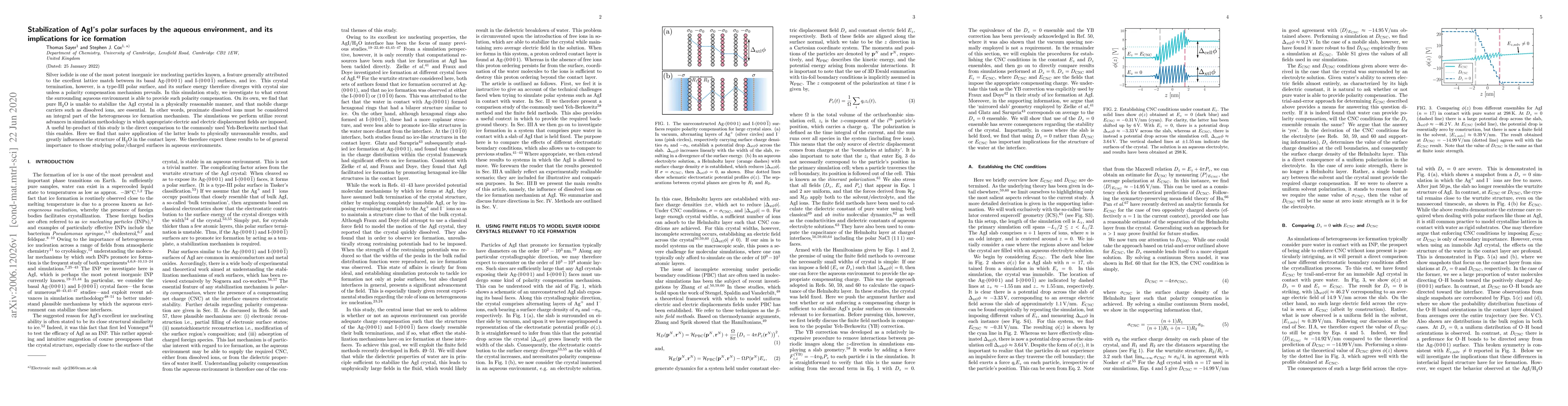 Silver iodide is one of the most potent inorganic ice nucleating particles known, a feature generally attributed to the excellent lattice match between its basal Ag-(0001) and I-(000-1) surfaces, and ice. This crystal termination, however, is a type-III polar surface, and its surface energy therefore diverges with crystal size unless a polarity compensation mechanism prevails. In this simulation study, we investigate to what extent the surrounding aqueous environment is able to provide such polarity compensation. On its own, we find that pure water is unable to stabilize the AgI crystal in a physically reasonable manner, and that mobile charge carriers such as dissolved ions, are essential. In other words, proximate dissolved ions must be considered an integral part of the heterogeneous ice formation mechanism. The simulations we perform utilize recent advances in simulation methodology in which appropriate electric and electric displacement fields are imposed. A useful by-product of this study is the direct comparison to the commonly used Yeh-Berkowitz method that this enables. Here we find that naive application of the latter leads to physically unreasonable results, and greatly influences the structure of water in the contact layer. We therefore expect these results to be of general importance to those studying polar/charged surfaces in aqueous environments.