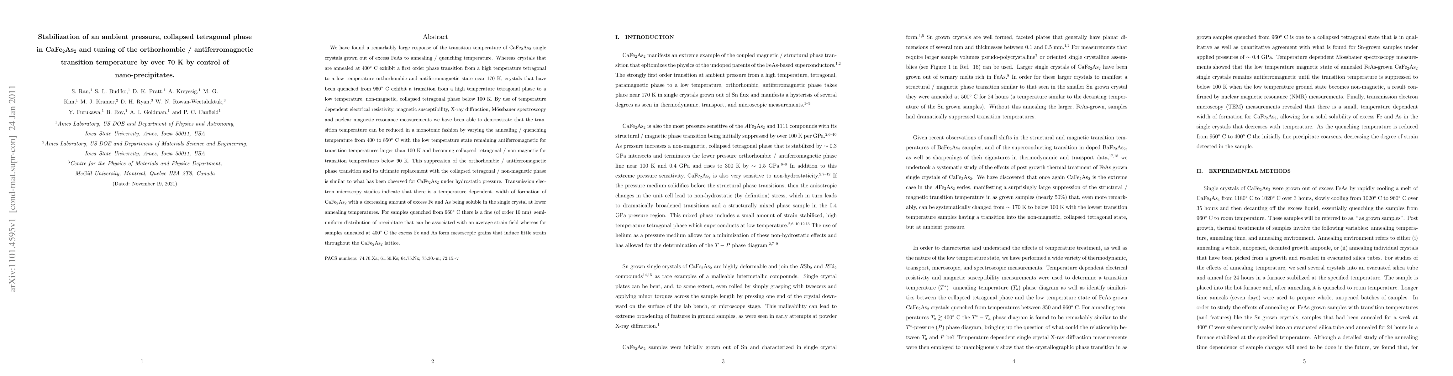This study investigates the stabilization of a collapsed tetragonal phase in CaFe2As2 through annealing and quenching, resulting in a tunable orthorhombic/antiferromagnetic transition temperature by over 70 K, influenced by the formation of nano-precipitates. Transition temperatures can be suppressed by adjusting annealing/quenching temperatures, altering the phase from antiferromagnetic to non-magnetic with distinct structural characteristics.