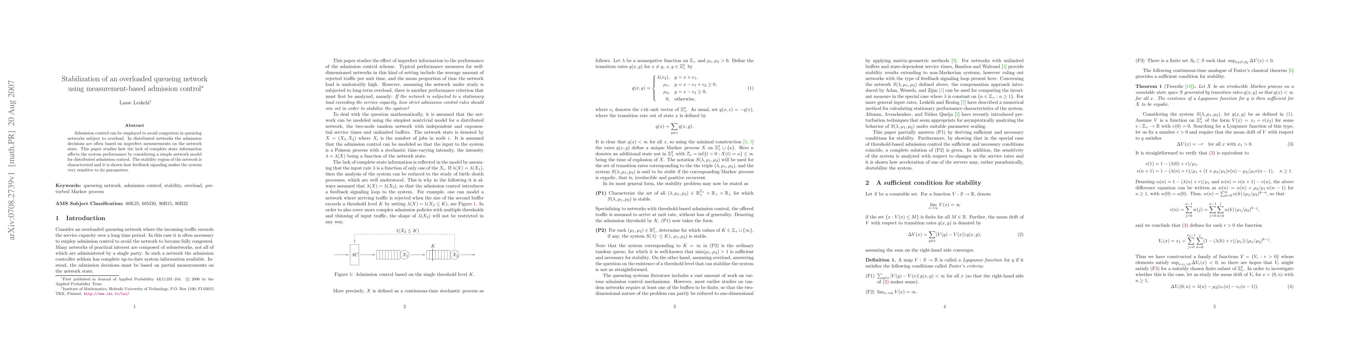 This paper investigates the impact of imperfect measurement-based admission control on the stability of overloaded queueing networks. It characterizes the stability region and demonstrates that feedback signaling significantly influences system performance sensitivity to parameters.