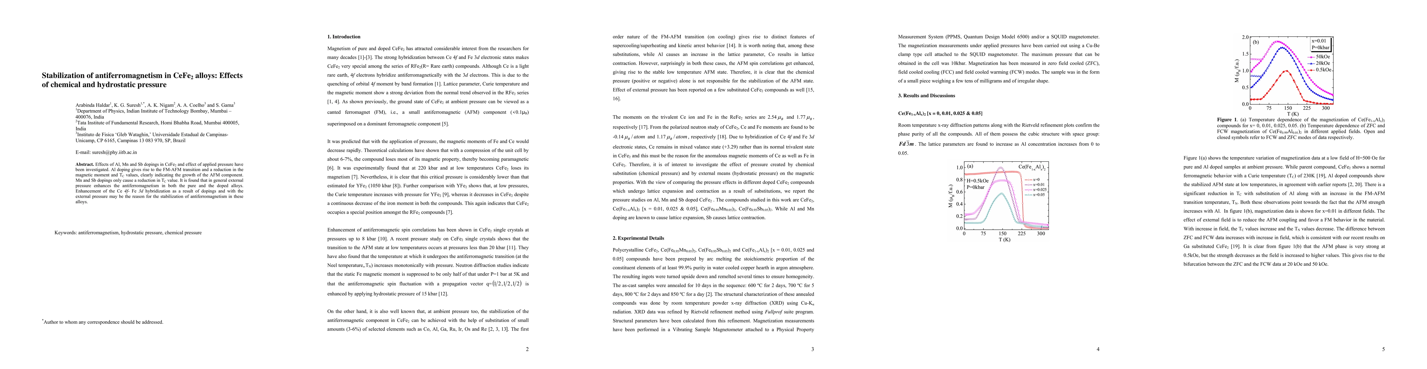 Effects of Al, Mn and Sb dopings in CeFe2 and effect of applied pressure have been investigated. Al doping gives rise to the FM-AFM transition and a reduction in the magnetic moment and TC values, clearly indicating the growth of the AFM component. Mn and Sb dopings only cause a reduction in TC value. It is found that in general external pressure enhances the antiferromagnetism in both the pure and the doped alloys. Enhancement of the Ce 4f- Fe 3d hybridization as a result of dopings and with the external pressure may be the reason for the stabilization of antiferromagnetism in these alloys.