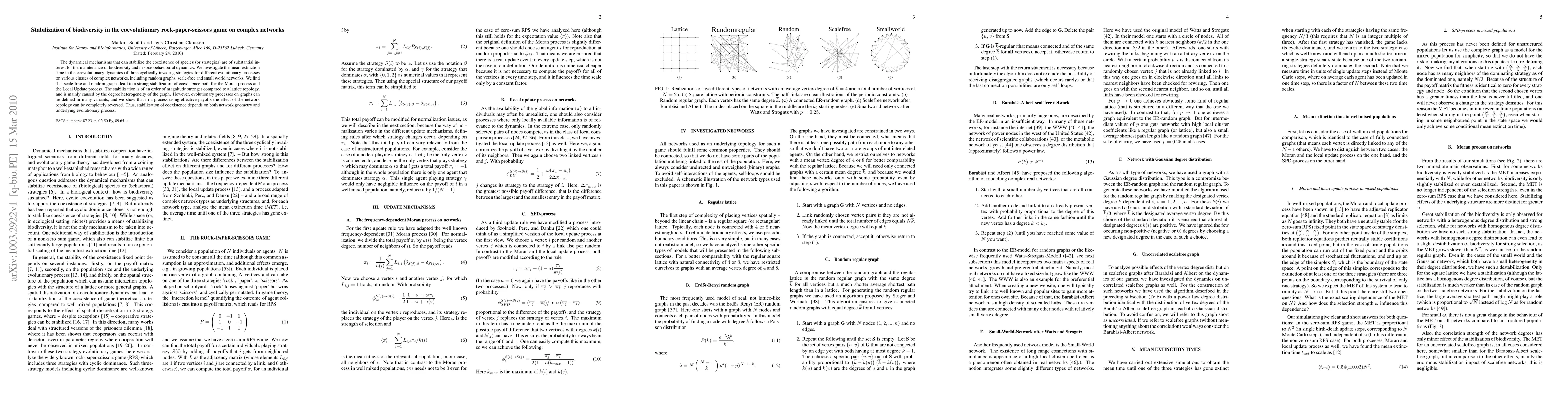 The dynamical mechanisms that can stabilize the coexistence of species (or strategies) are of substantial interest for the maintenance of biodiversity and in sociobehavioural dynamics. We investigate the mean extinction time in the coevolutionary dynamics of three cyclically invading strategies for different evolutionary processes on various classes of complex networks, including random graphs, scale-free and small world networks. We find that scale-free and random graphs lead to a strong stabilization of coexistence both for the Moran process and the Local Update process. The stabilization is of an order of magnitude stronger compared to a lattice topology, and is mainly caused by the degree heterogeneity of the graph. However, evolutionary processes on graphs can be defined in many variants, and we show that in a process using effective payoffs the effect of the network topology can be completely reversed. Thus, stabilization of coexistence depends on both network geometry and underlying evolutionary process.