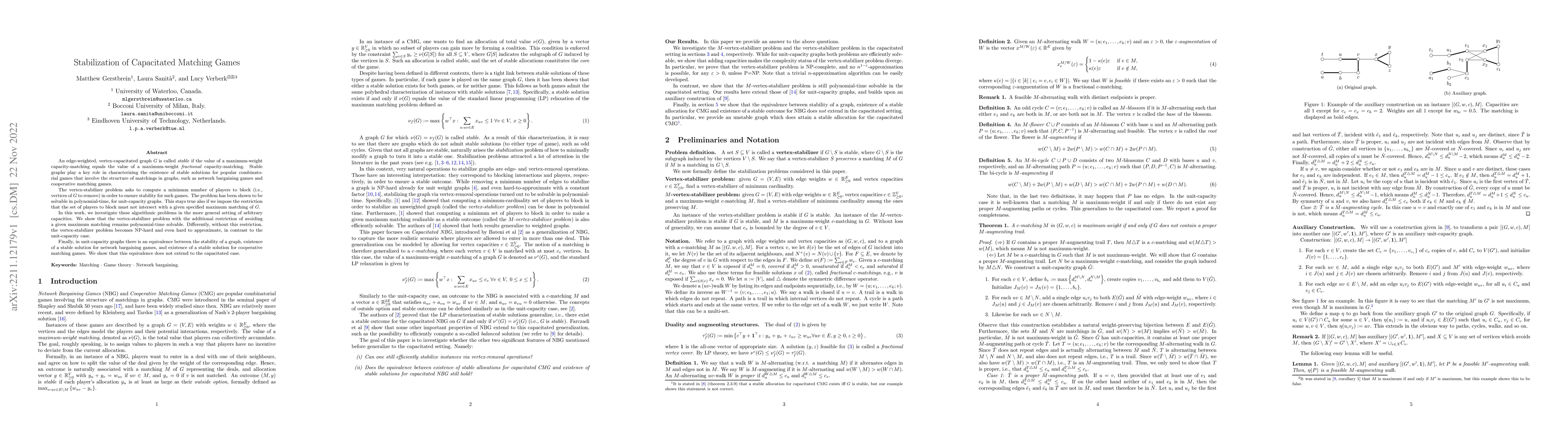 An edge-weighted, vertex-capacitated graph G is called stable if the value of a maximum-weight capacity-matching equals the value of a maximum-weight fractional capacity-matching. Stable graphs play a key role in characterizing the existence of stable solutions for popular combinatorial games that involve the structure of matchings in graphs, such as network bargaining games and cooperative matching games. The vertex-stabilizer problem asks to compute a minimum number of players to block (i.e., vertices of G to remove) in order to ensure stability for such games. The problem has been shown to be solvable in polynomial-time, for unit-capacity graphs. This stays true also if we impose the restriction that the set of players to block must not intersect with a given specified maximum matching of G. In this work, we investigate these algorithmic problems in the more general setting of arbitrary capacities. We show that the vertex-stabilizer problem with the additional restriction of avoiding a given maximum matching remains polynomial-time solvable. Differently, without this restriction, the vertex-stabilizer problem becomes NP-hard and even hard to approximate, in contrast to the unit-capacity case. Finally, in unit-capacity graphs there is an equivalence between the stability of a graph, existence of a stable solution for network bargaining games, and existence of a stable solution for cooperative matching games. We show that this equivalence does not extend to the capacitated case.