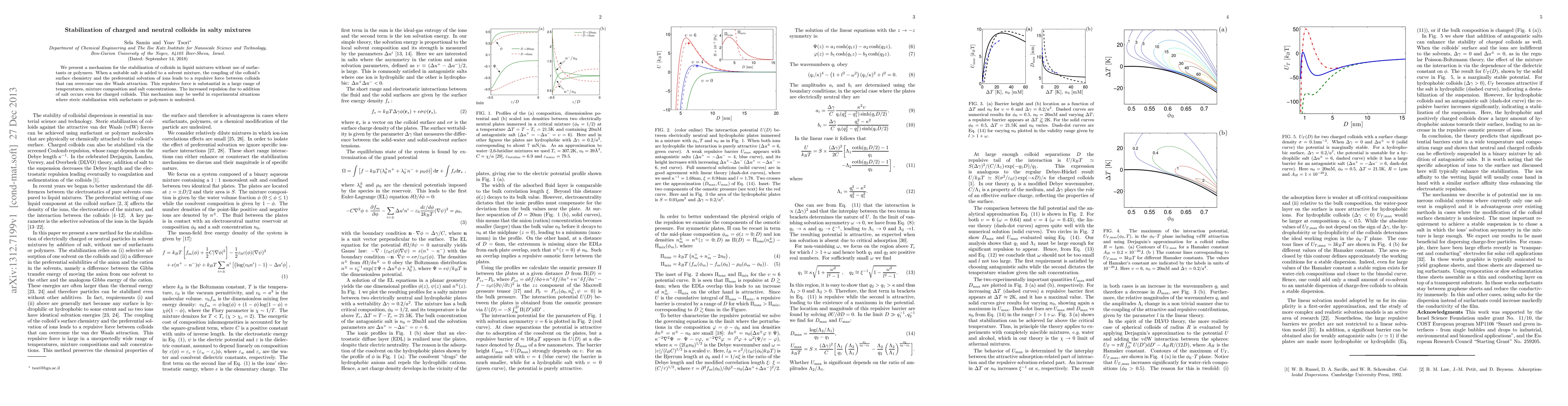 This paper proposes a salt-induced stabilization mechanism for colloids in liquid mixtures, eliminating the need for surfactants or polymers. The addition of a suitable salt generates a repulsive force between colloids, overcoming van der Waals attraction, which is effective across various temperatures and salt concentrations.