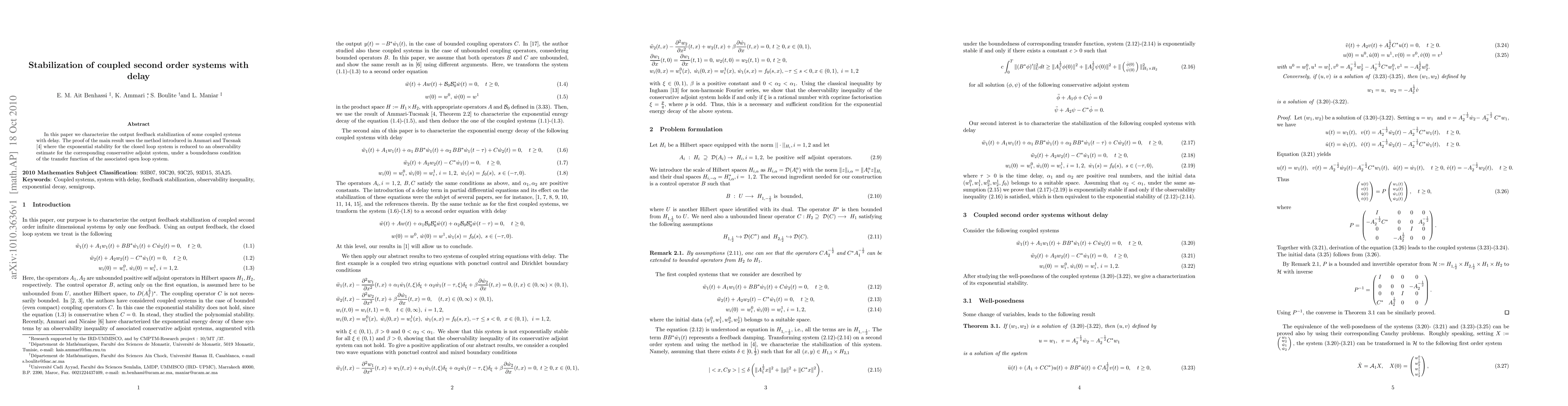 In this paper we characterize the output feedback stabilization of some coupled systems with delay. The proof of the main result uses the method introduced in Ammari and Tucsnak \cite{at} where the exponential stability for the closed loop system is reduced to an observability estimate for the corresponding conservative adjoint system, under a boundedness condition of the transfer function of the associated open loop system.