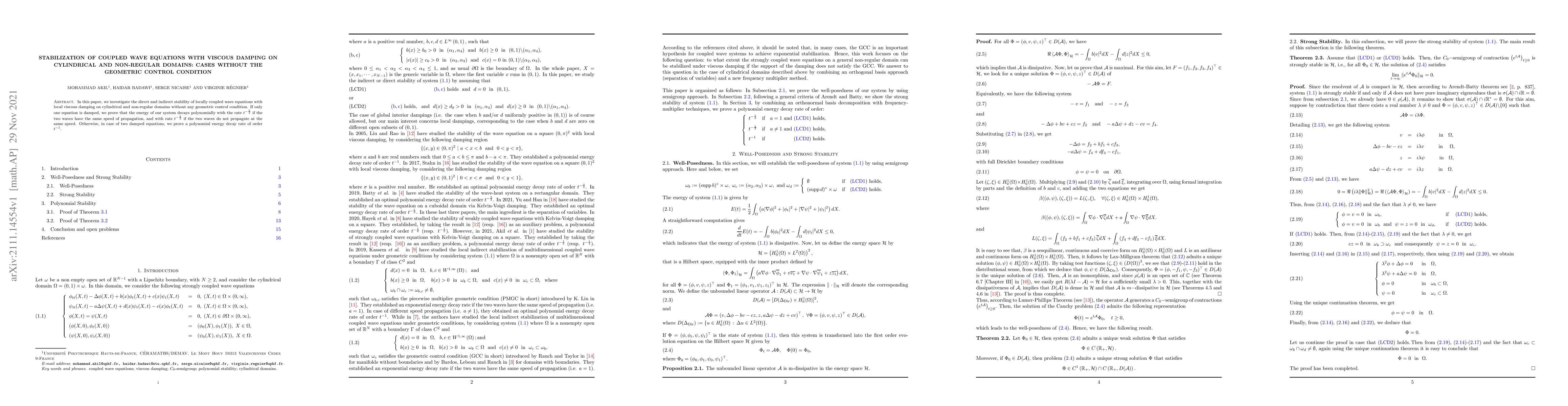 This paper examines the stability of coupled wave equations with viscous damping on cylindrical and non-regular domains without geometric control. It shows polynomial decay rates for energy, specifically $t^{-\frac{1}{2}}$ when wave speeds are equal and $t^{-\frac{1}{3}}$ when they differ, for single damping, and $t^{-1}$ for two damped equations.