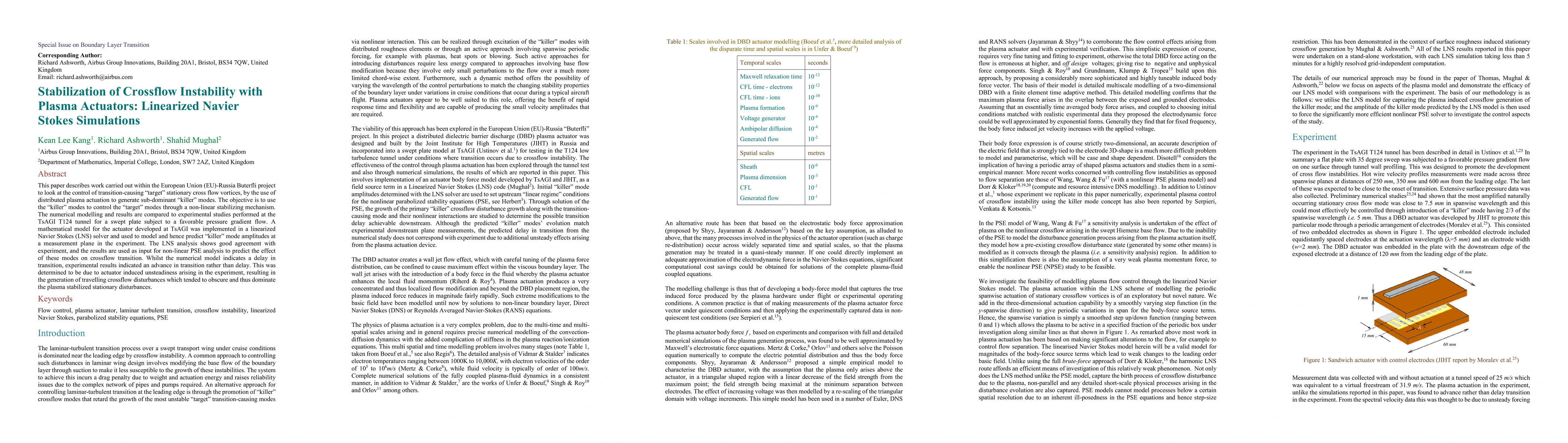 This paper describes work carried out within the European Union (EU)-Russia Buterfli project to look at the control of transition-causing "target" stationary cross flow vortices, by the use of distributed plasma actuation to generate sub-dominant "killer" modes. The objective is to use the "killer" modes to control the "target" modes through a non-linear stabilizing mechanism. The numerical modelling and results are compared to experimental studies performed at the TsAGI T124 tunnel for a swept plate subject to a favorable pressure gradient flow. A mathematical model for the actuator developed at TsAGI was implemented in a linearized Navier Stokes (LNS) solver and used to model and hence predict "killer" mode amplitudes at a measurement plane in the experiment. The LNS analysis shows good agreement with experiment, and the results are used as input for non-linear PSE analysis to predict the effect of these modes on crossflow transition. Whilst the numerical model indicates a delay in transition, experimental results indicated an advance in transition rather than delay. This was determined to be due to actuator induced unsteadiness arising in the experiment, resulting in the generation of travelling crossflow disturbances which tended to obscure and thus dominate the plasma stabilized stationary disturbances.
