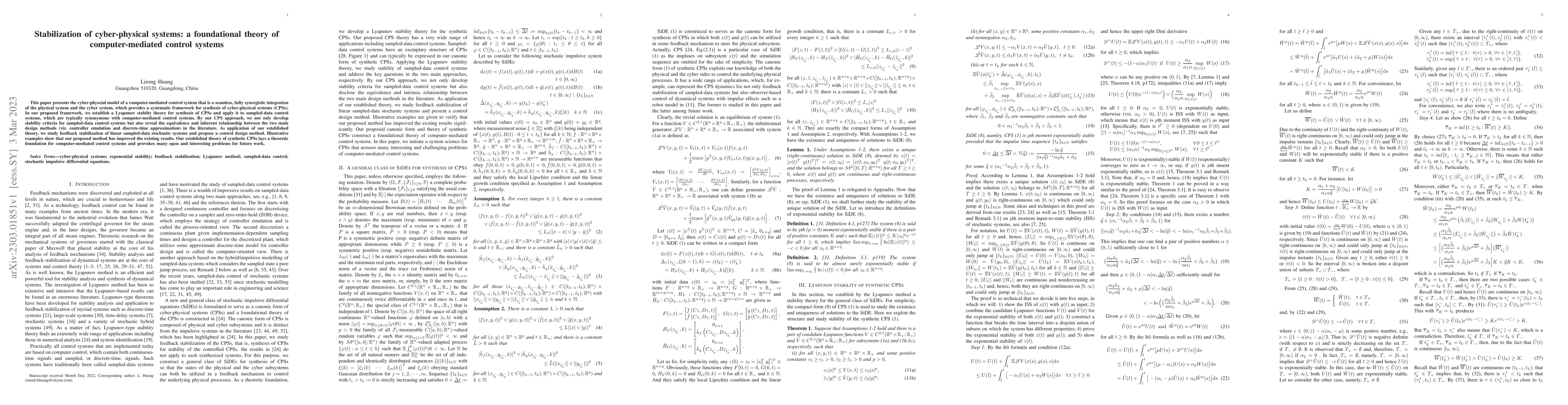 This paper introduces a foundational theory for the synthesis of cyber-physical systems (CPSs) through a Lyapunov stability framework, revealing the equivalence between two main design methods and proposing a new control design method for linear sampled-data stochastic systems. The established theory provides a systematic approach for computer-mediated control systems and opens new research avenues.
