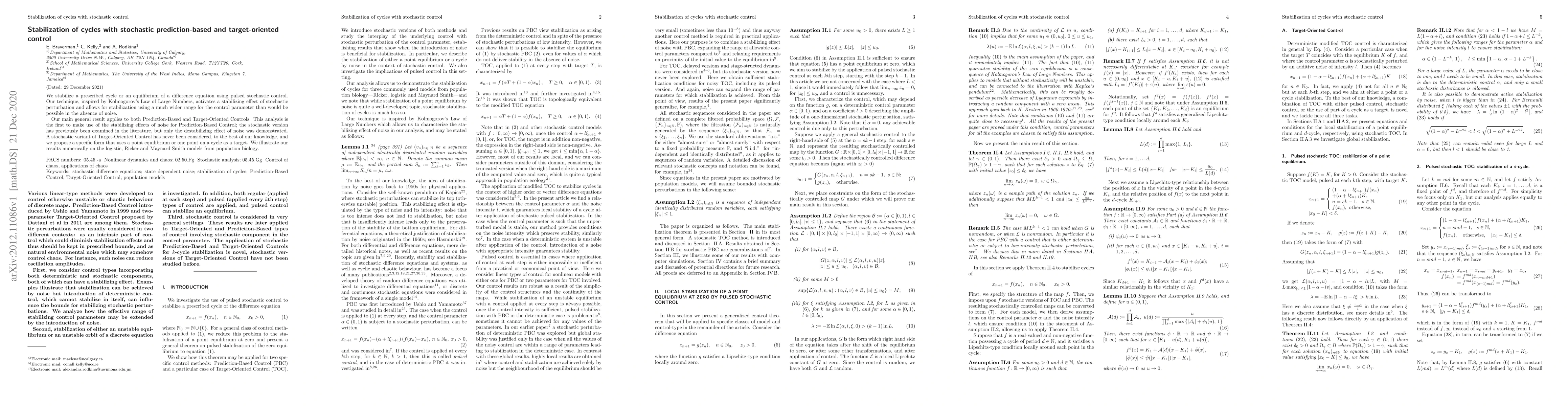 We stabilize a prescribed cycle or an equilibrium of the difference equation using pulsed stochastic control. Our technique, inspired by the Kolmogorov's Law of Large Numbers, activates a stabilizing effect of stochastic perturbation and allows for stabilization using a much wider range for the control parameter than would be possible in the absence of noise. Our main general result applies to both Prediction-Based and Target-Oriented Controls. This analysis is the first to make use of the stabilizing effects of noise for Prediction-Based Control; the stochastic version has been examined in the literature, but only the destabilizing effect of noise was demonstrated. A stochastic variant of Target-Oriented Control has never been considered, to the best of our knowledge, and we propose a specific form that uses a point equilibrium or one point on a cycle as a target. We demonstrate our results numerically on the logistic, Ricker and Maynard Smith models from population biology.