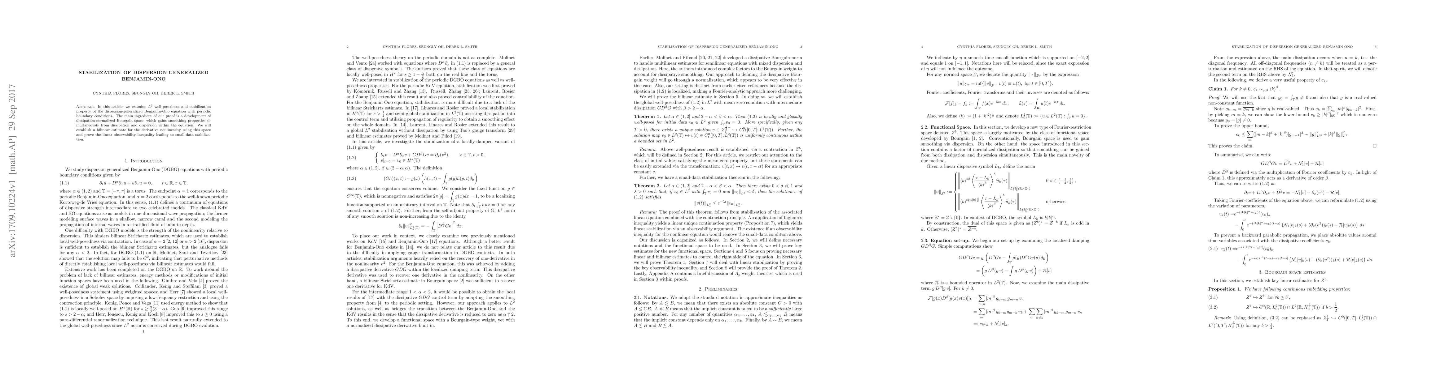 This paper investigates the $L^2$ well-posedness and stabilization of the dispersion-generalized Benjamin-Ono equation under periodic boundary conditions, utilizing a newly developed dissipation-normalized Bourgain space for proving bilinear estimates and establishing small-data stabilization via a linear observability inequality.