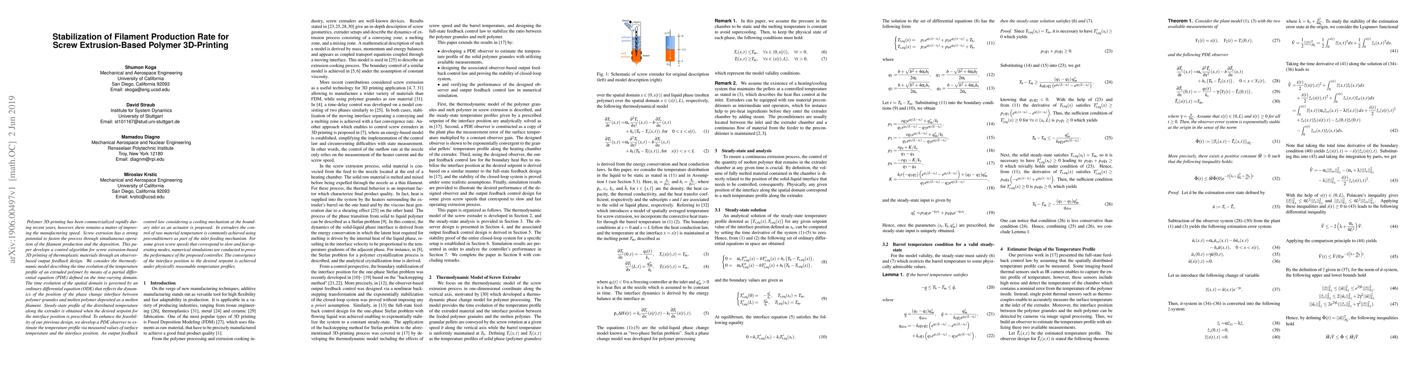 This paper develops a control algorithm for screw extrusion-based 3D printing to stabilize filament production rate, employing an observer-based output feedback design. The proposed PDE observer estimates temperature profiles and a control law regulates the cooling mechanism to achieve steady-state conditions, validated through numerical simulations.