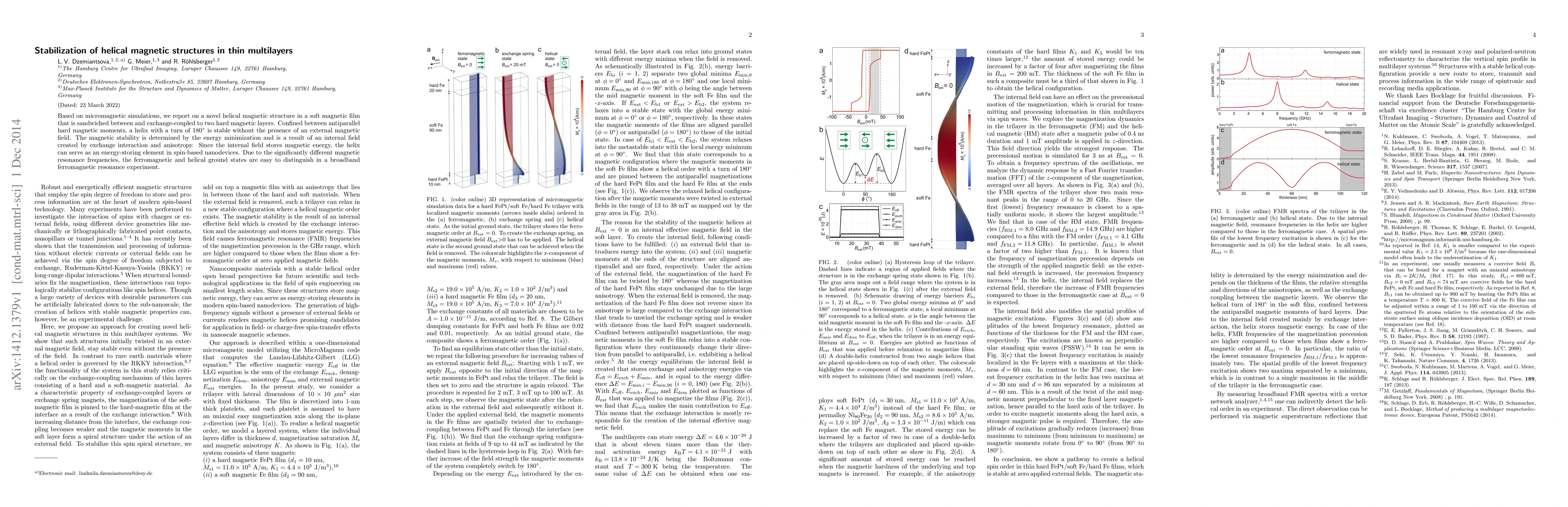 Researchers discovered a novel helical magnetic structure in a thin multilayer film that is stable without an external magnetic field due to internal fields created by exchange interaction and anisotropy. This finding opens up possibilities for energy-storing elements in spin-based nanodevices.
