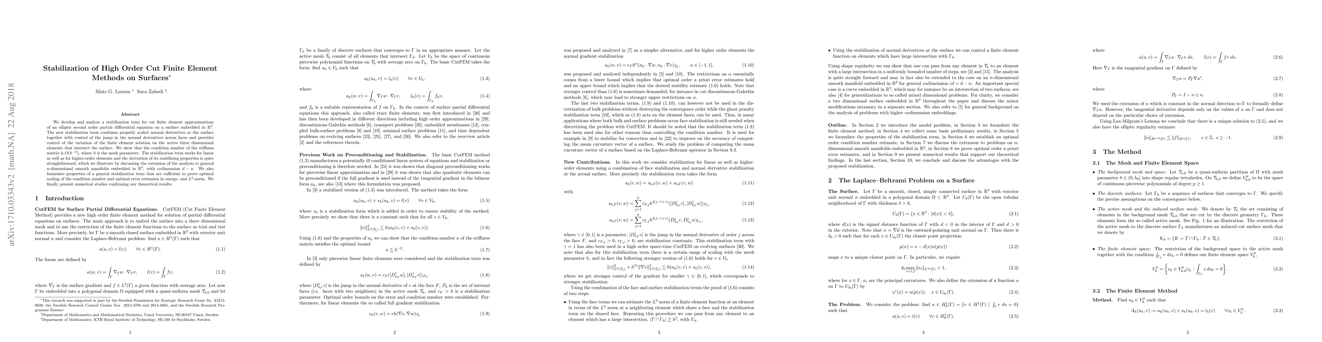 We develop and analyze a stabilization term for cut finite element approximations of an elliptic second order partial differential equation on a surface embedded in $\mathbb{R}^d$. The new stabilization term combines properly scaled normal derivatives at the surface together with control of the jump in the normal derivatives across faces and provides control of the variation of the finite element solution on the active three dimensional elements that intersect the surface. We show that the condition number of the stiffness matrix is $O(h^{-2})$, where $h$ is the mesh parameter. The stabilization term works for linear as well as for higher-order elements and the derivation of its stabilizing properties is quite straightforward, which we illustrate by discussing the extension of the analysis to general $n$-dimensional smooth manifolds embedded in $\mathbb{R}^d$, with codimension $d-n$. We also formulate properties of a general stabilization term that are sufficient to prove optimal scaling of the condition number and optimal error estimates in energy- and $L^2$-norm. We finally present numerical studies confirming our theoretical results.