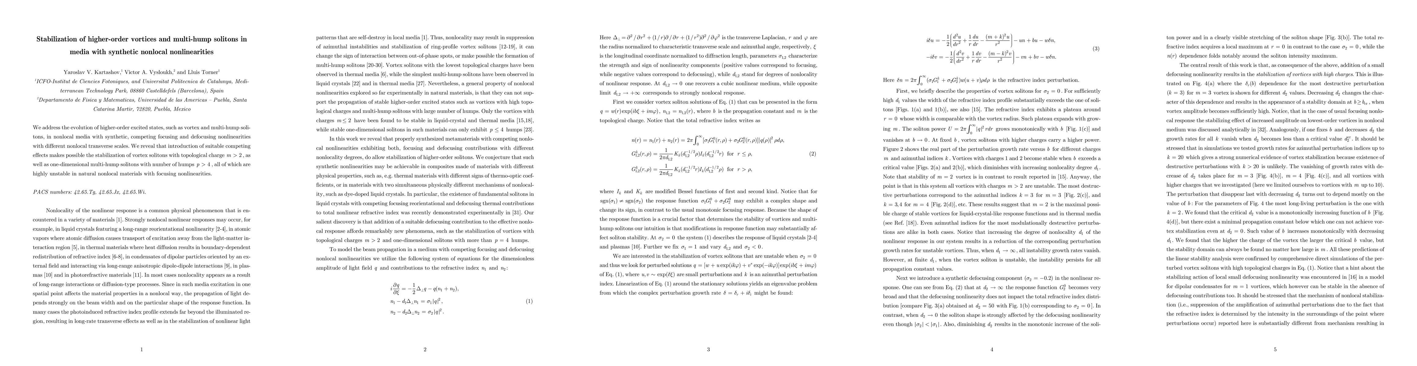 This paper investigates the stabilization of higher-order vortex solitons and multi-hump solitons in media featuring synthetic nonlocal nonlinearities. The study demonstrates that appropriate competing nonlinear effects can stabilize highly unstable solitons with topological charges greater than 2 and more than four humps.