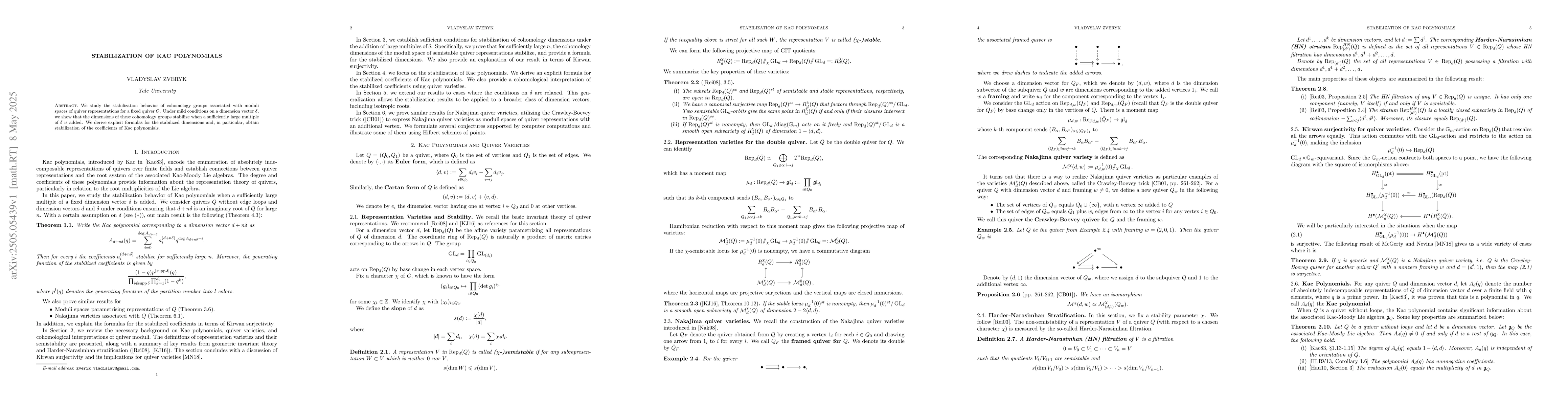 Researchers studied how dimensions of cohomology groups change when adding a multiple of a dimension vector to moduli spaces of quiver representations. They found that under certain conditions, these dimensions stabilize, particularly for Kac polynomials.