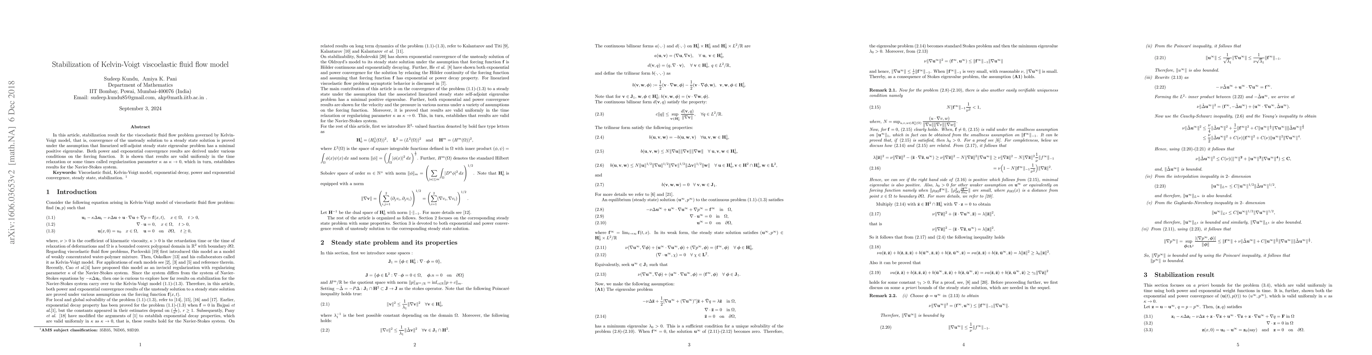 This paper proves stabilization results for the Kelvin-Voigt model of viscoelastic fluid flow, showing convergence to a steady state under specific conditions on the forcing function. It demonstrates both power and exponential convergence, valid uniformly as the relaxation parameter approaches zero, establishing results for the Navier-Stokes system.