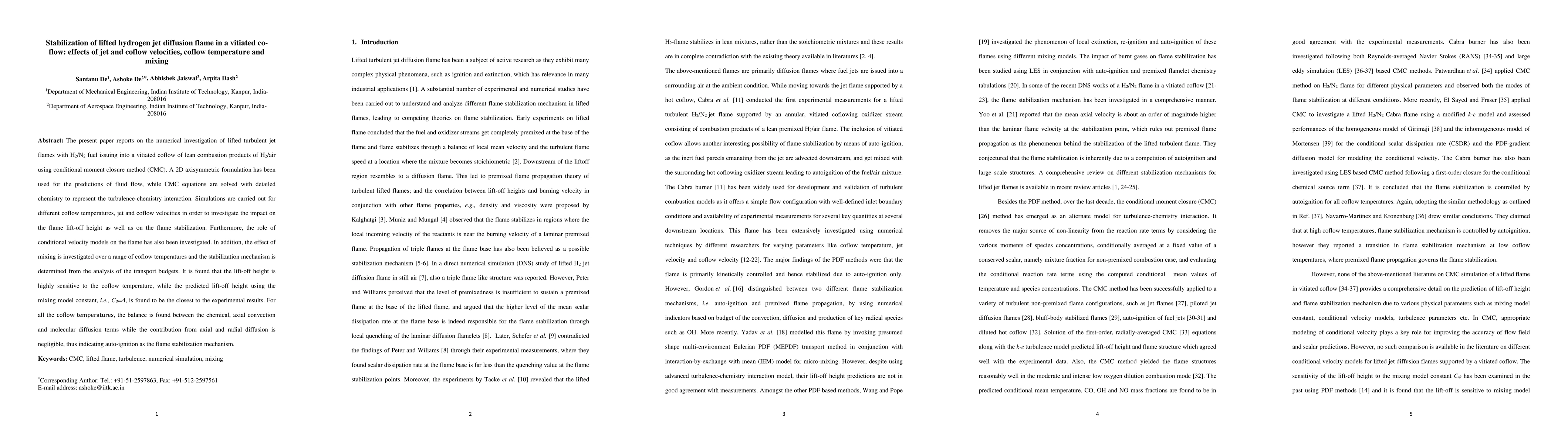 This paper numerically investigates the stabilization of lifted hydrogen jet diffusion flames in a vitiated co-flow using a conditional moment closure method. The study finds that lift-off height is highly sensitive to coflow temperature, and auto-ignition is the stabilization mechanism, with the mixing model constant CΦ=4 closely matching experimental results.