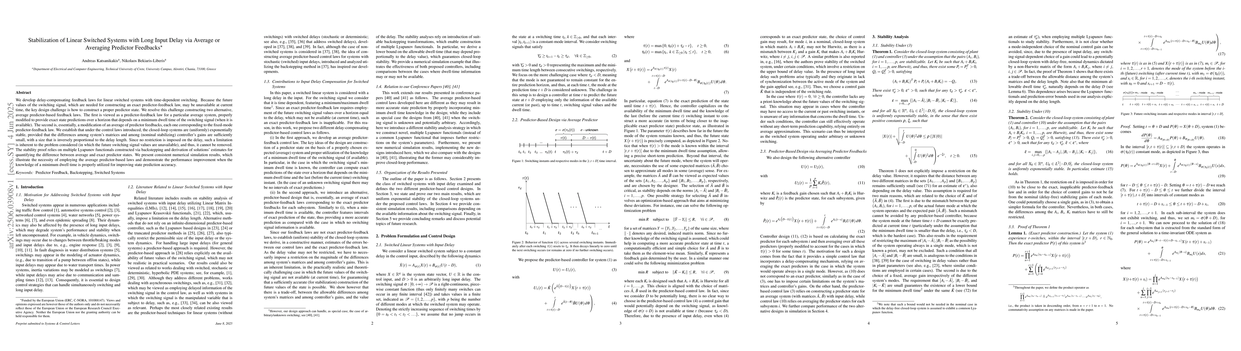 The paper presents novel average predictor-based feedback laws for stabilizing linear switched systems with long input delays, ensuring exponential stability under certain conditions.