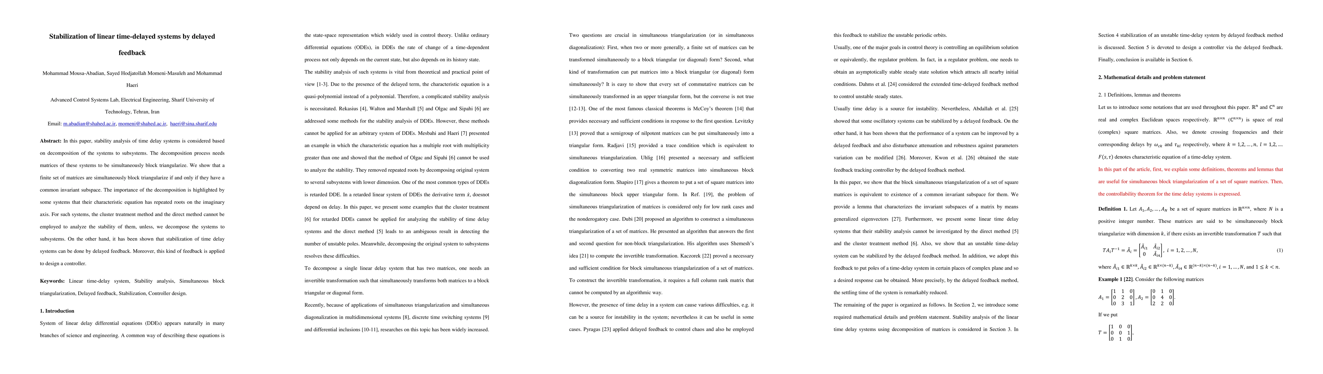 This paper investigates the stability of linear time-delayed systems through subsystem decomposition, showing that simultaneous block triangularization of system matrices indicates a common invariant subspace. Stabilization via delayed feedback is demonstrated, and a controller is designed using this method for systems with repeated roots on the imaginary axis.