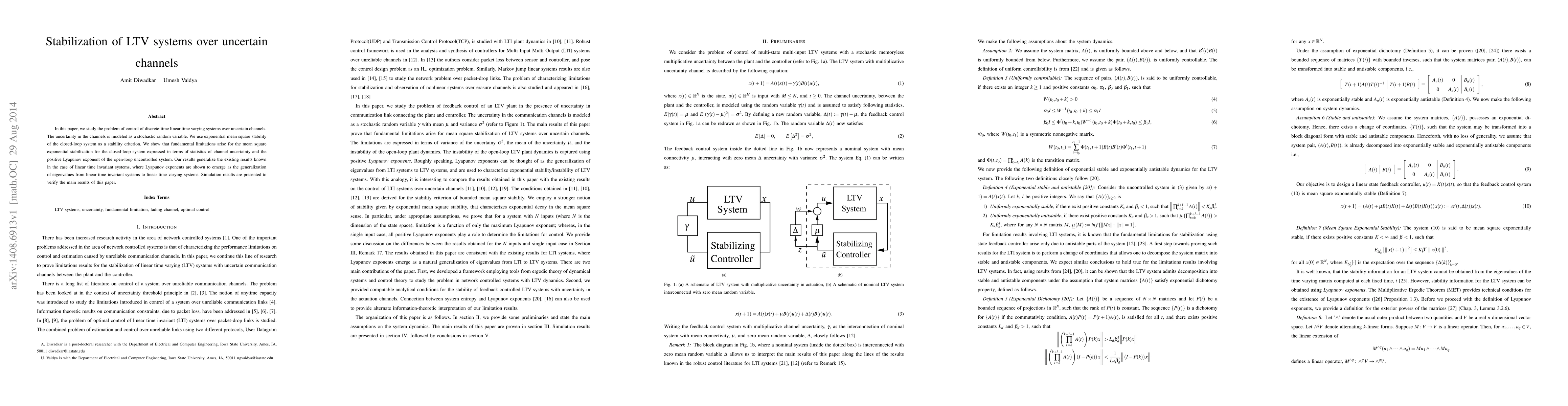 In this paper, we study the problem of control of discrete-time linear time varying systems over uncertain channels. The uncertainty in the channels is modeled as a stochastic random variable. We use exponential mean square stability of the closed-loop system as a stability criterion. We show that fundamental limitations arise for the mean square exponential stabilization for the closed-loop system expressed in terms of statistics of channel uncertainty and the positive Lyapunov exponent of the open-loop uncontrolled system. Our results generalize the existing results known in the case of linear time invariant systems, where Lyapunov exponents are shown to emerge as the generalization of eigenvalues from linear time invariant systems to linear time varying systems. Simulation results are presented to verify the main results of this paper.