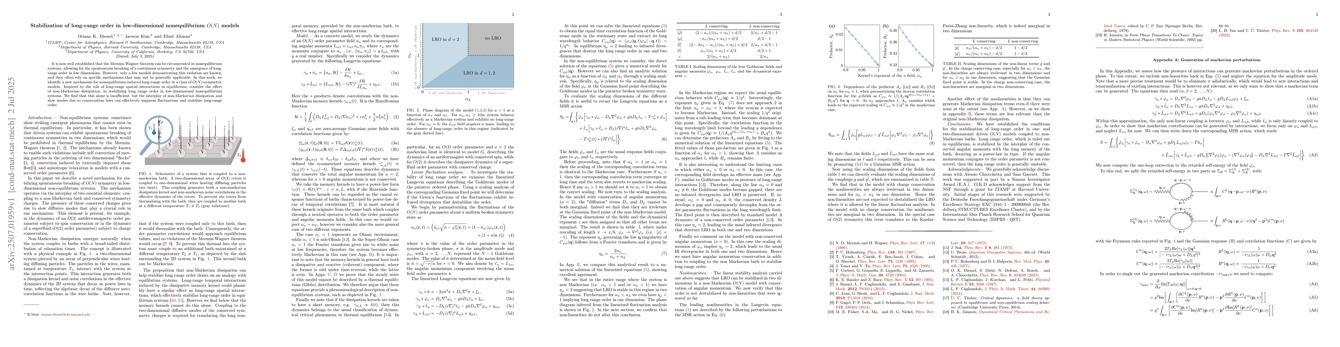It is now well established that the Mermin-Wagner theorem can be circumvented in nonequilibrium systems, allowing for the spontaneous breaking of a continuous symmetry and the emergence of long-range order in low dimensions. However, only a few models demonstrating this violation are known, and they often rely on specific mechanisms that may not be generally applicable. In this work, we identify a new mechanism for nonequilibrium-induced long-range order in a class of $O(N)$-symmetric models. Inspired by the role of long-range spatial interactions in equilibrium, consider the effect of non-Markovian dissipation, in stabilizing long range order in low-dimensional nonequilibrium systems. We find that this alone is insufficient, but the interplay of non-Markovian dissipation and slow modes due to conservation laws can effectively suppress fluctuations and stabilize long-range order.