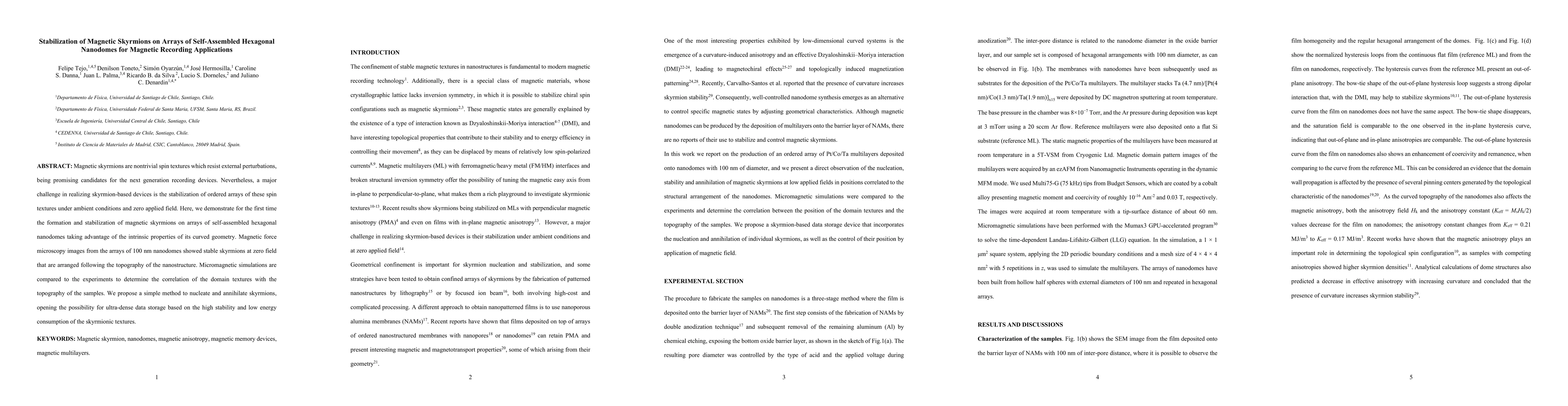 This paper presents the stabilization of magnetic skyrmions on arrays of self-assembled hexagonal nanodomes, demonstrating the formation of stable skyrmions at zero field due to the nanodomes' curved geometry. The study proposes a method for skyrmion manipulation, suggesting potential for ultra-dense magnetic recording applications.