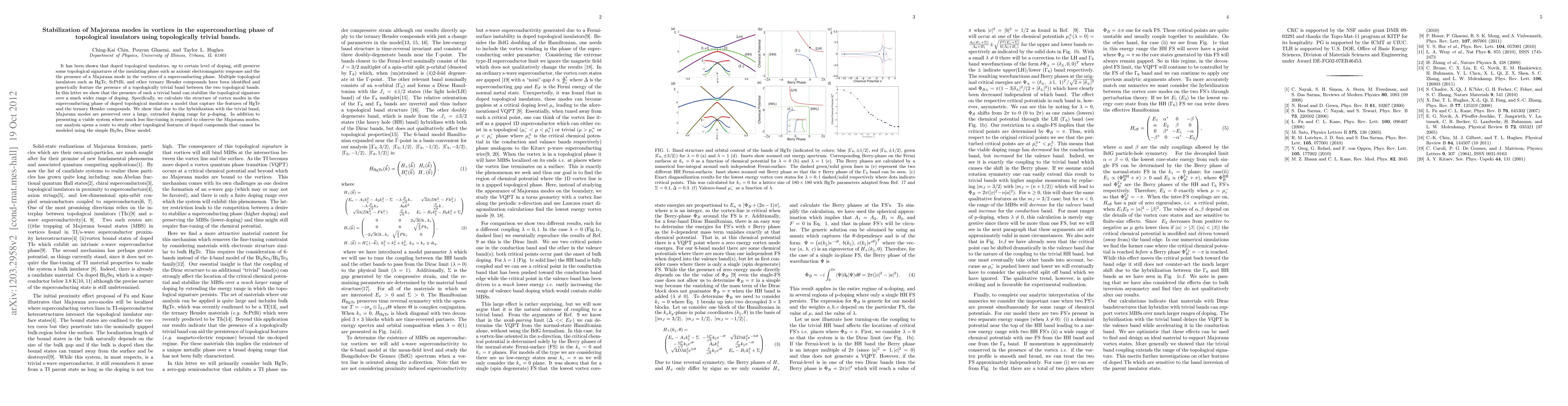 This paper investigates how Majorana modes in vortices of superconducting topological insulators can be stabilized by hybridization with topologically trivial bands, particularly for complex materials like HgTe or ScPtBi. It demonstrates that this hybridization extends the doping range for p-doping while reducing it for n-doping, potentially stabilizing other topological phenomena over a wider doping range.