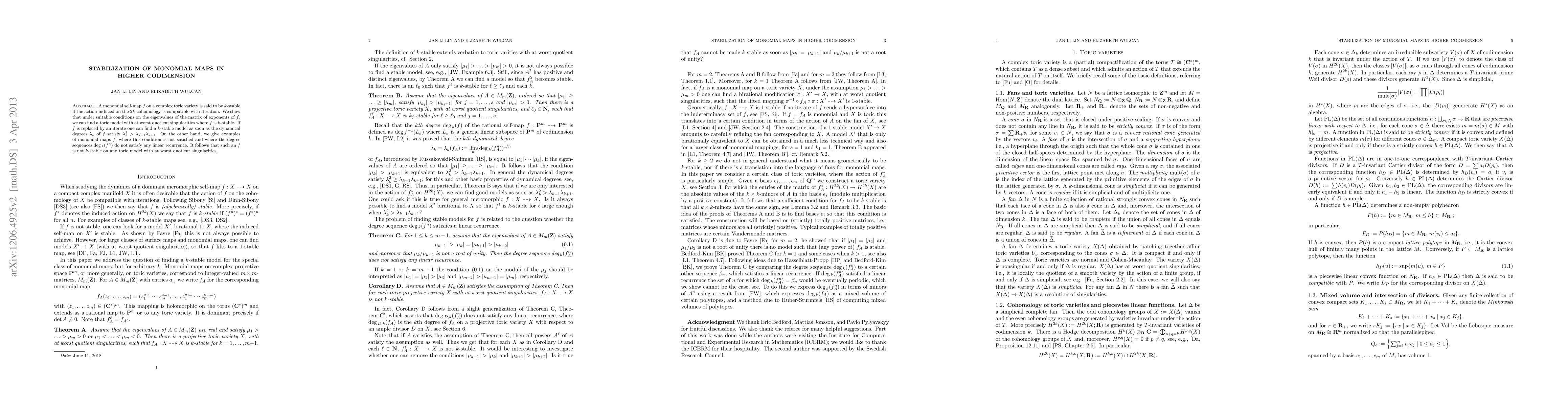 A monomial self-map $f$ on a complex toric variety is said to be $k$-stable if the action induced on the $2k$-cohomology is compatible with iteration. We show that under suitable conditions on the eigenvalues of the matrix of exponents of $f$, we can find a toric model with at worst quotient singularities where $f$ is $k$-stable. If $f$ is replaced by an iterate one can find a $k$-stable model as soon as the dynamical degrees $\lambda_k$ of $f$ satisfy $\lambda_k^2>\lambda_{k-1}\lambda_{k+1}$. On the other hand, we give examples of monomial maps $f$, where this condition is not satisfied and where the degree sequences $\deg_k(f^n)$ do not satisfy any linear recurrence. It follows that such an $f$ is not $k$-stable on any toric model with at worst quotient singularities.