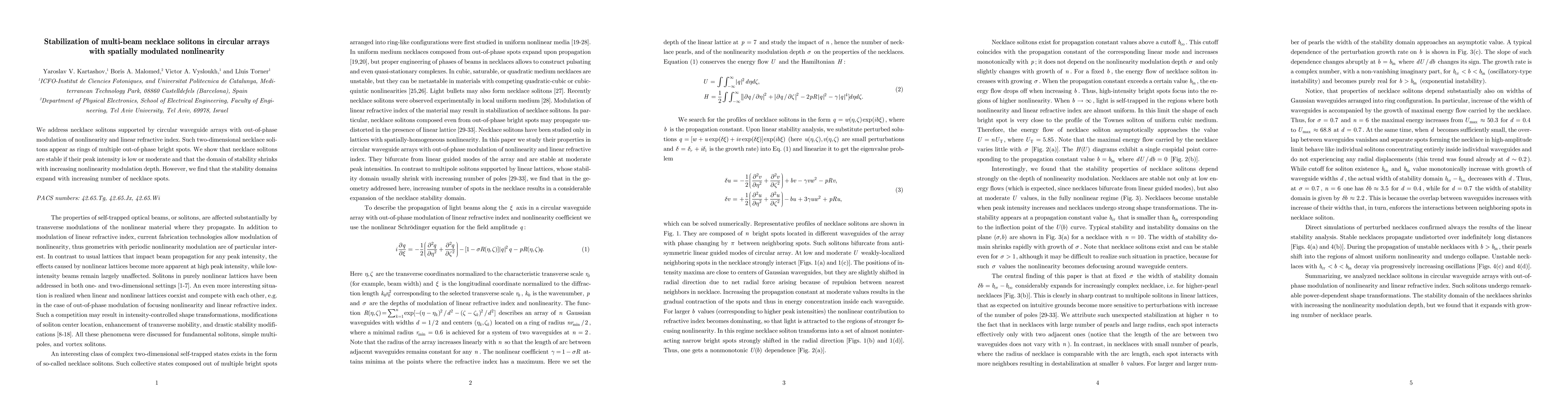 Two-line summary: This paper investigates the stability of multi-beam necklace solitons in circular waveguide arrays with spatially modulated nonlinearity, demonstrating that stability is maintained at low to moderate peak intensities but diminishes with deeper nonlinearity modulation, while stability domains expand with more necklace spots.