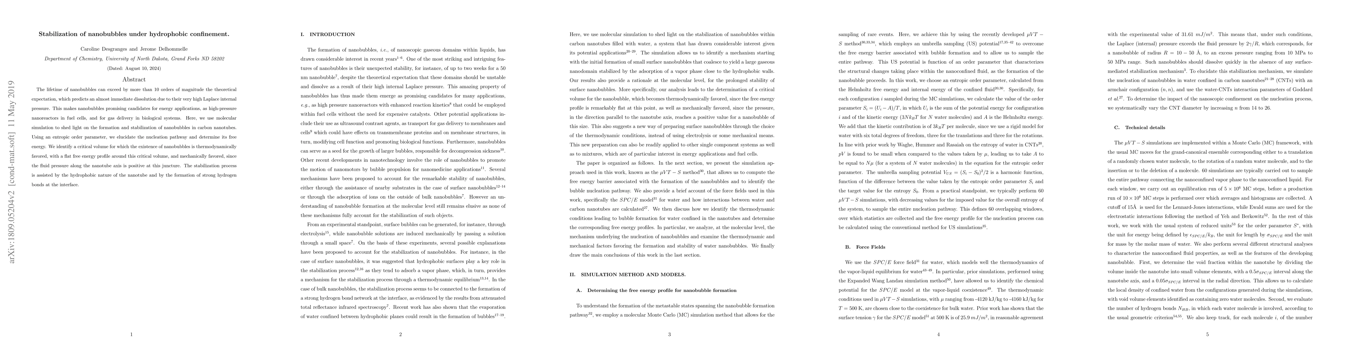 This paper investigates the molecular mechanisms behind the stabilization of nanobubbles under hydrophobic confinement using molecular simulations. It reveals a critical volume where nanobubbles are thermodynamically and mechanically favored, with stabilization aided by the hydrophobic nature of carbon nanotubes and strong hydrogen bonds at the interface.