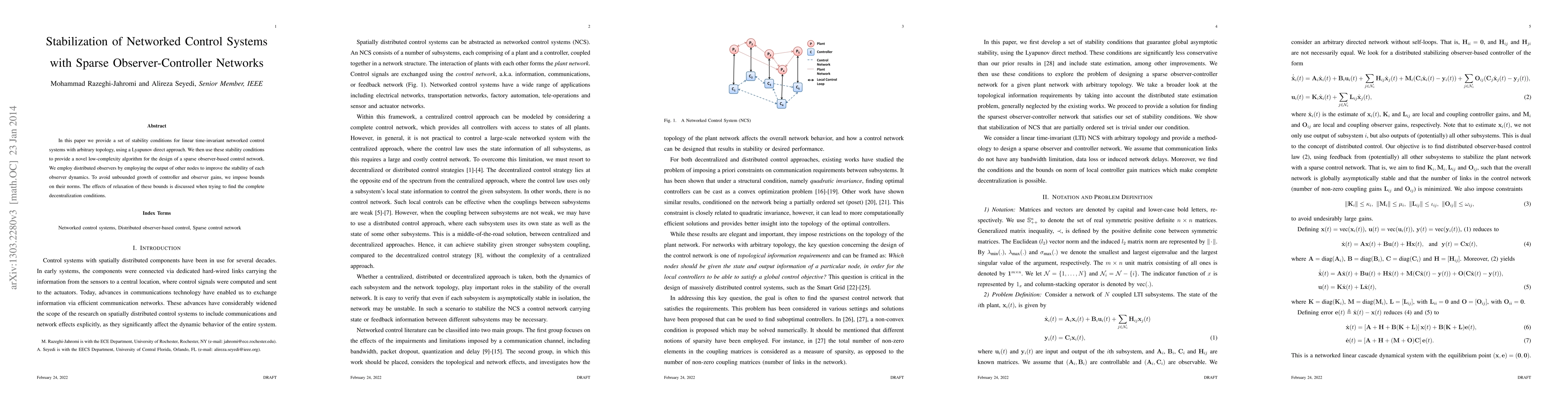 This paper establishes stability conditions for networked control systems using a Lyapunov direct approach and proposes a low-complexity algorithm for designing sparse observer-based control networks. The method employs distributed observers and imposes norm bounds on gains to prevent unbounded growth, discussing the effects of relaxing these bounds for complete decentralization.