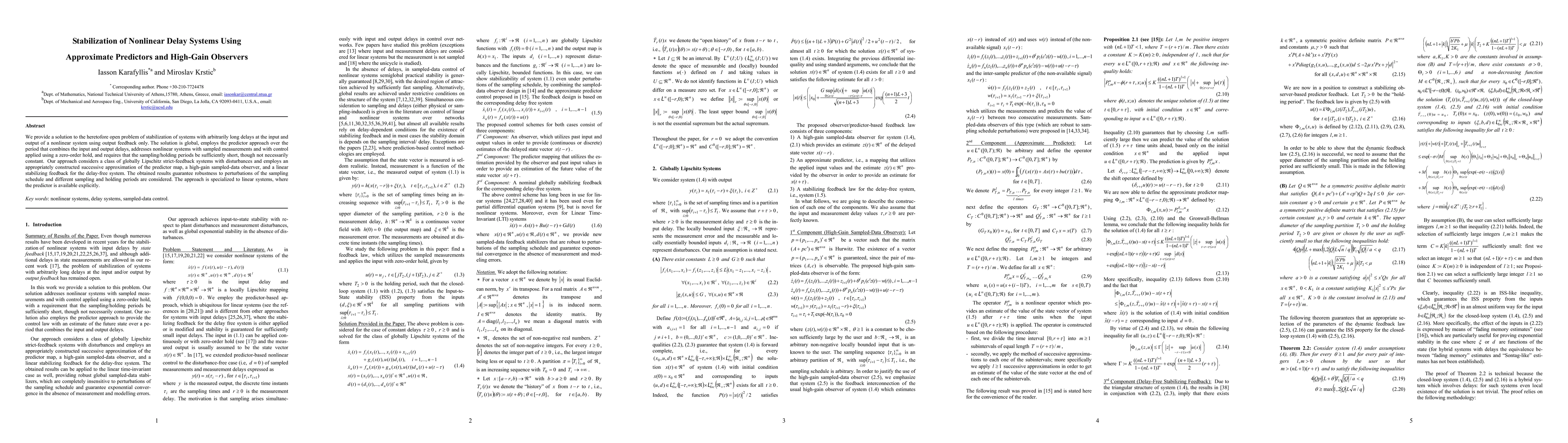 This paper presents a global stabilization method for nonlinear delay systems using output feedback, combining predictor approaches and high-gain observers. The method addresses systems with long delays, sampled measurements, and zero-order hold control, ensuring robustness to varying sampling periods.